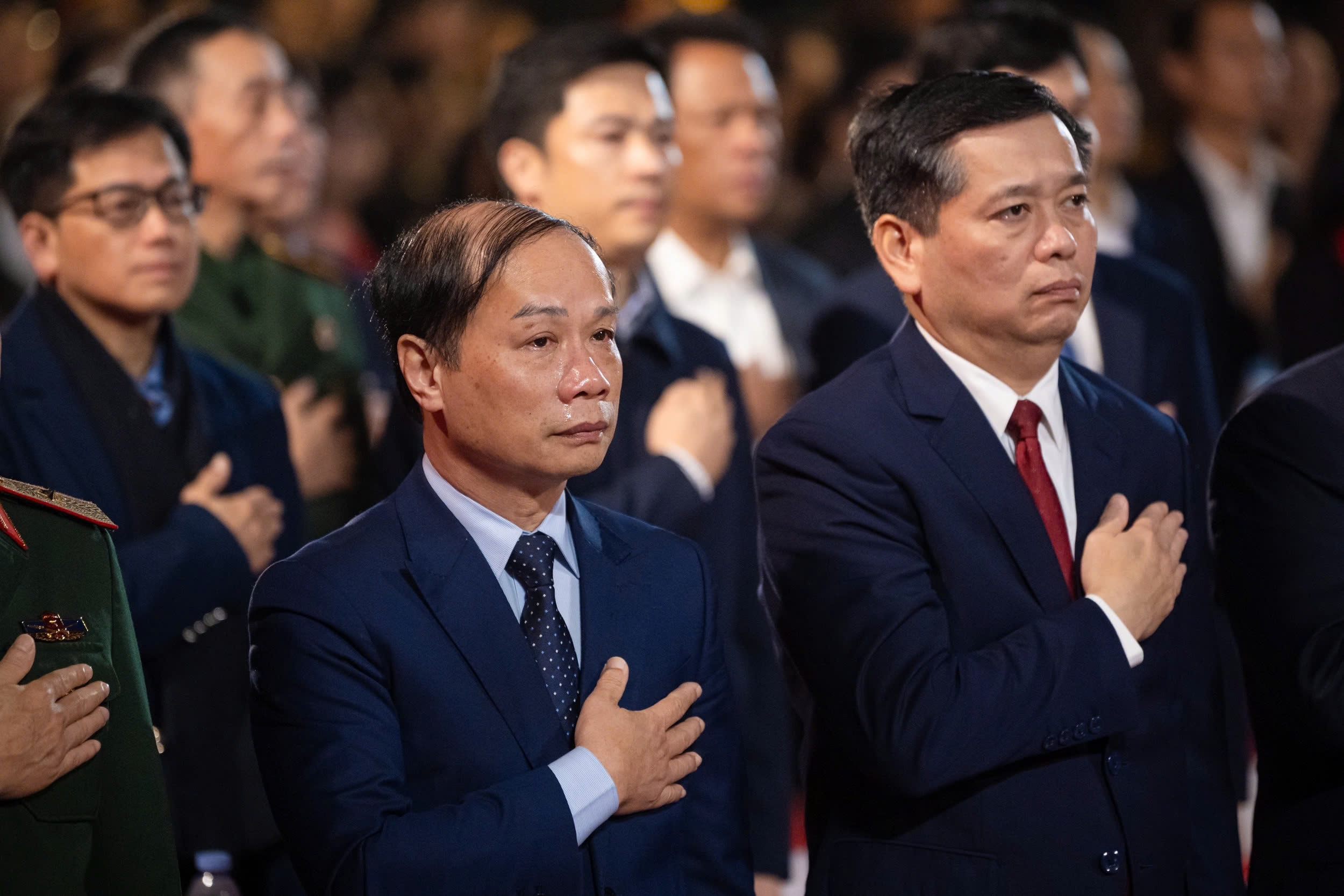 Tổng Bí thư Tô Lâm và các đại biểu tại điểm cầu Cao Bằng lặng lẽ đặt bàn tay lên trái tim mình khi nghe Di chúc của Người. Nguồn: qdnd.vn