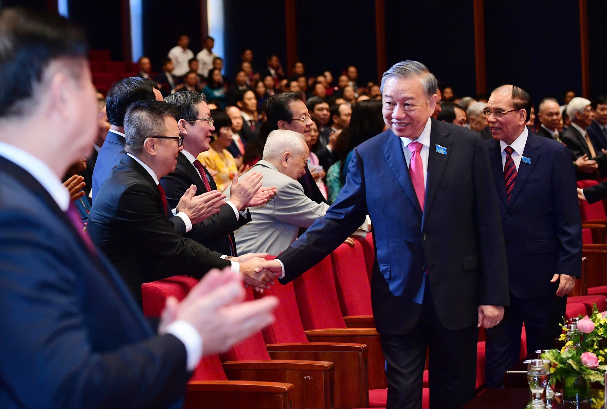 Tại hội trường lớn của Trung tâm Hội nghị Quốc gia, các đại biểu chào đón sự tham dự của Tổng Bí thư Tô Lâm cùng các lãnh đạo, nguyên lãnh đạo. Ảnh: Văn Thanh.