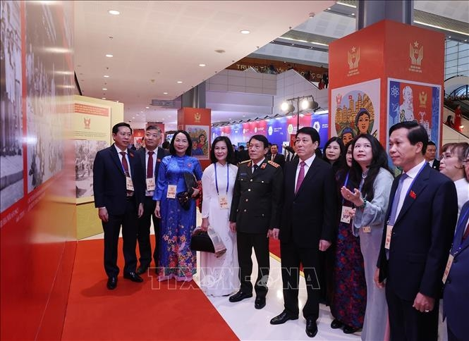 Chủ tịch nước Lương Cường và các đại biểu tham quan gian trưng bày của Thông tấn xã Việt Nam tại Đại hội Thi đua yêu nước toàn quốc lần thứ XI