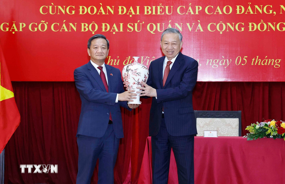 Tổng Bí thư Tô Lâm tặng quà lưu niệm cho Đại sứ quán Việt Nam tại Lào. (Ảnh: Thống Nhất/TTXVN)