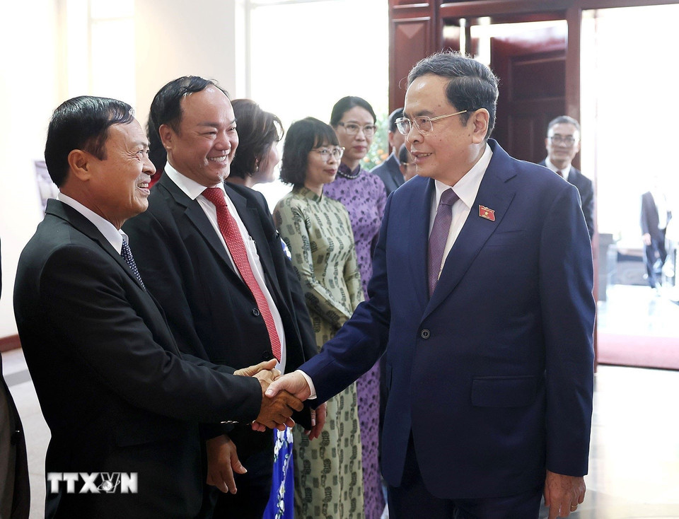 Thủ tướng Phạm Minh Chính và Chủ tịch Quốc hội Trần Thanh Mẫn cùng Đoàn đại biểu cấp cao Đảng, Nhà nước Việt Nam tham dự buổi gặp mặt. (Ảnh: Dương Giang/TTXVN)
