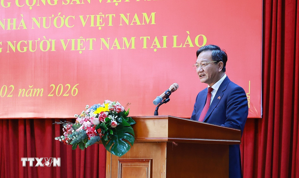 Đại sứ Việt Nam tại Lào Nguyễn Minh Tâm báo cáo tình hình cộng đồng người Việt Nam tại Lào. (Ảnh: Dương Giang/TTXVN)