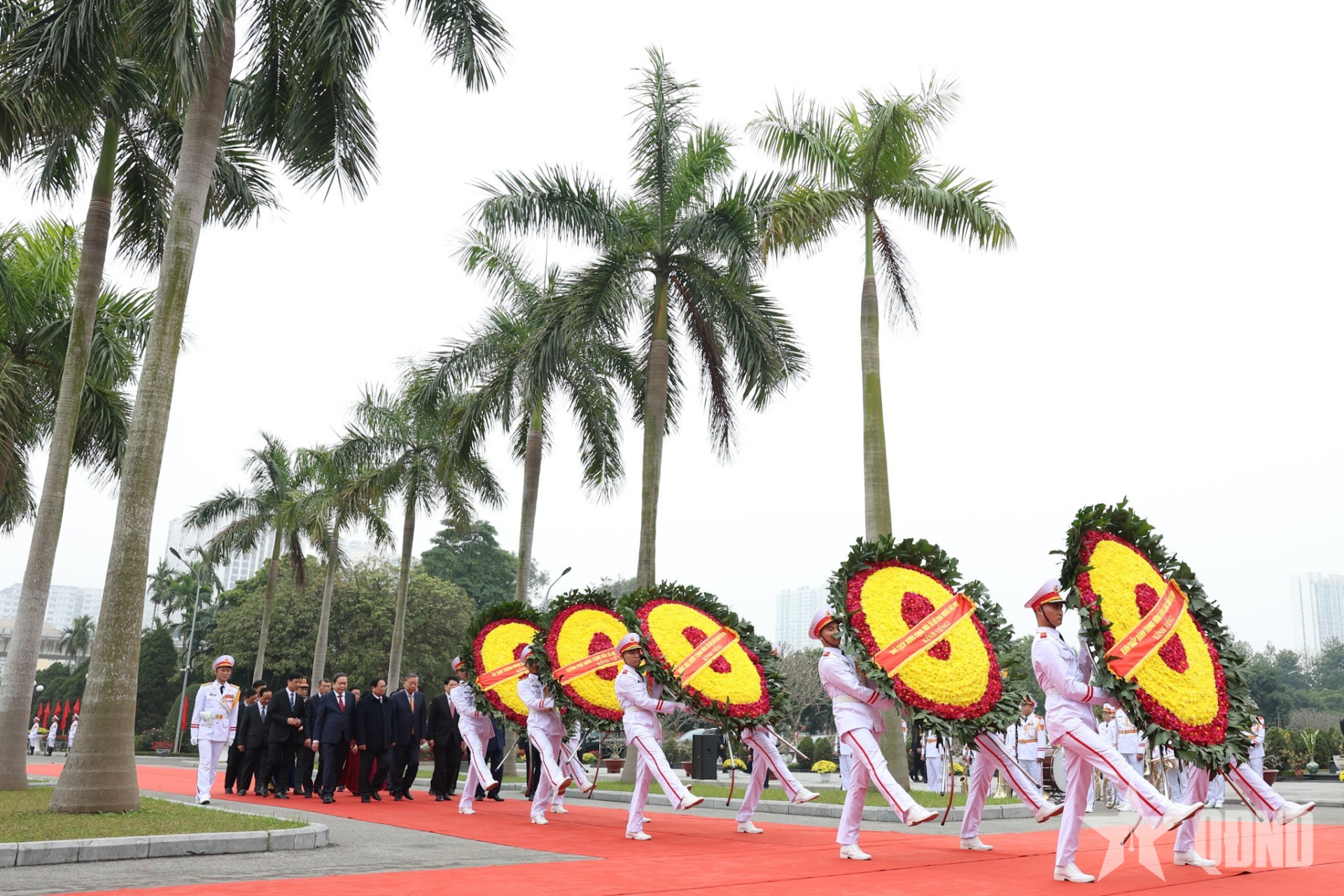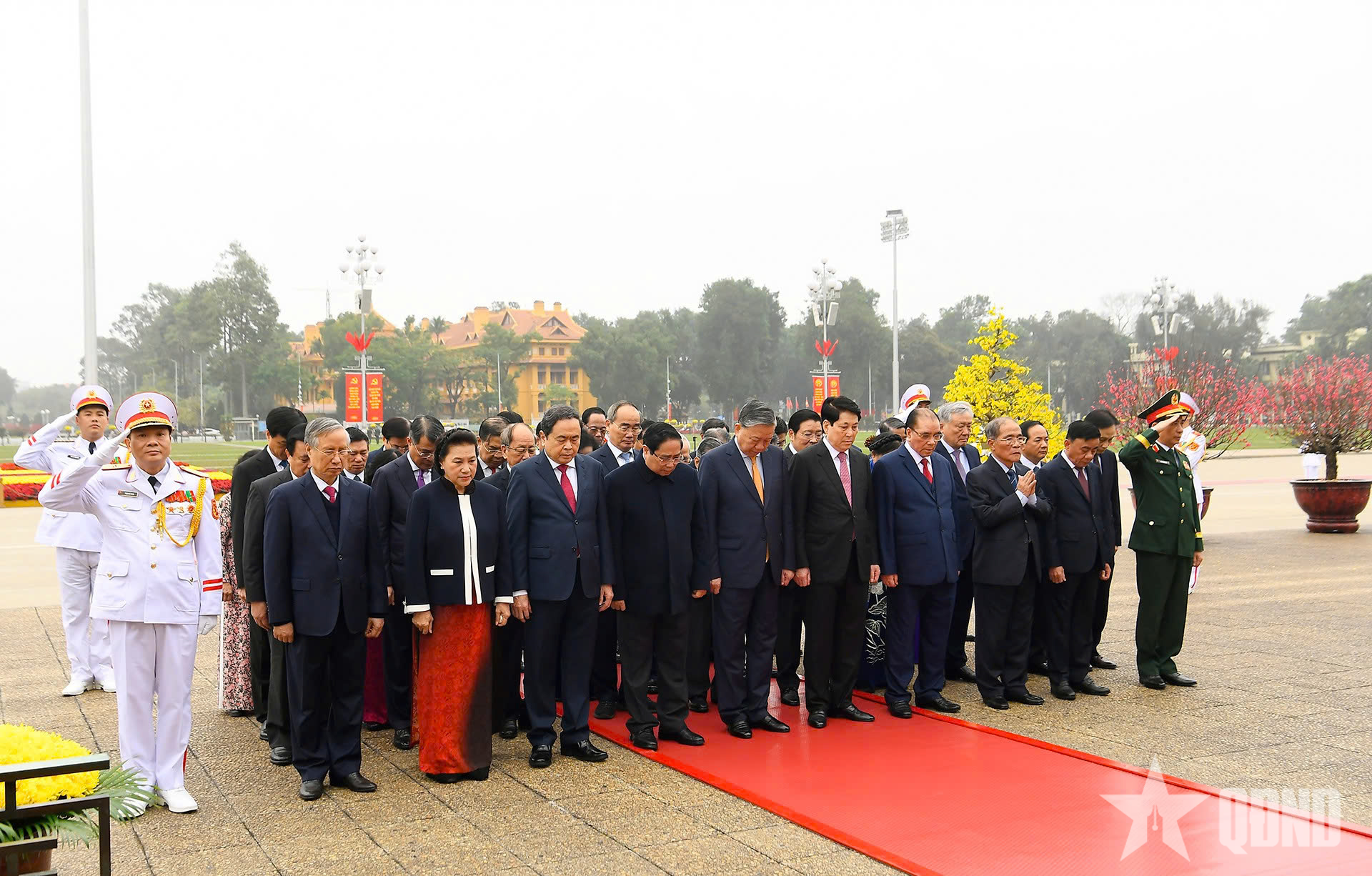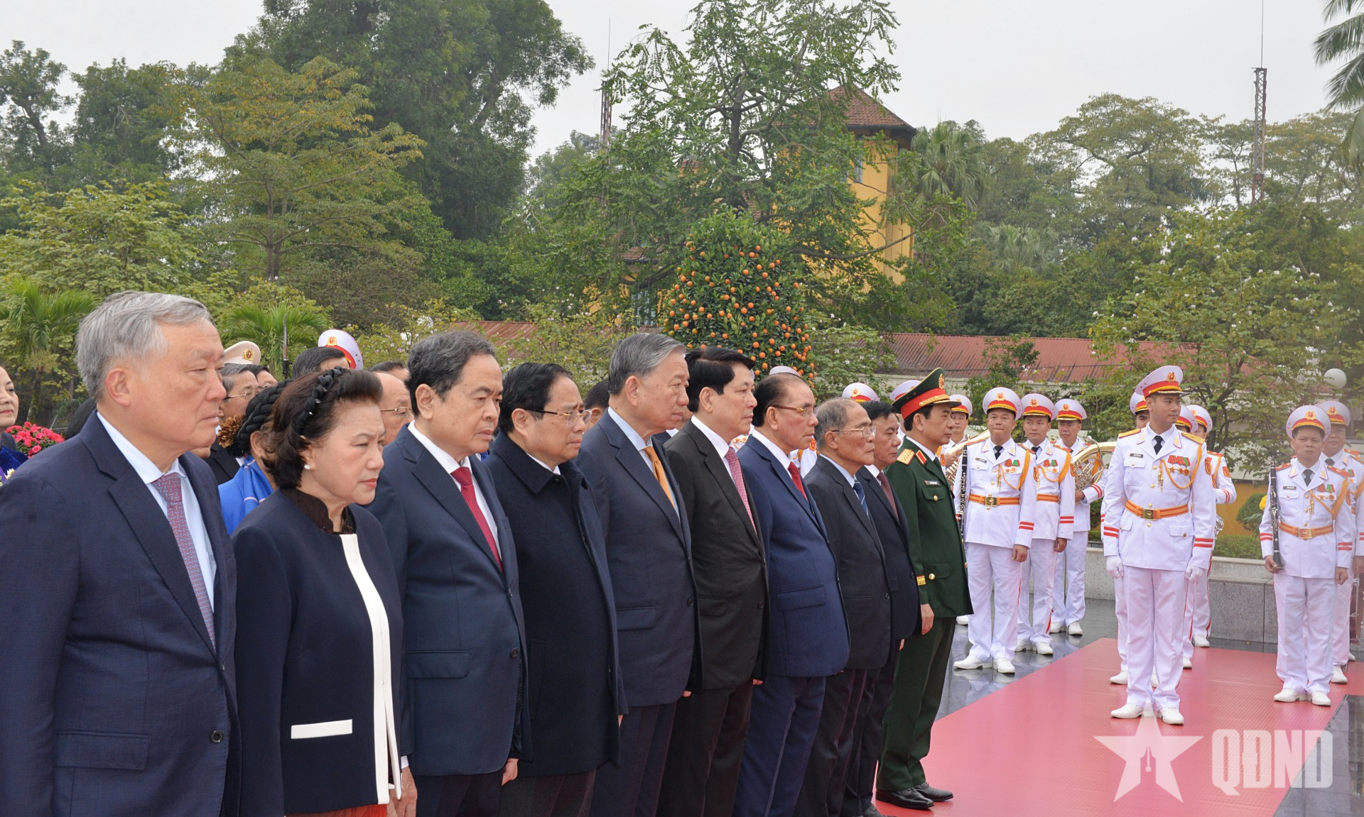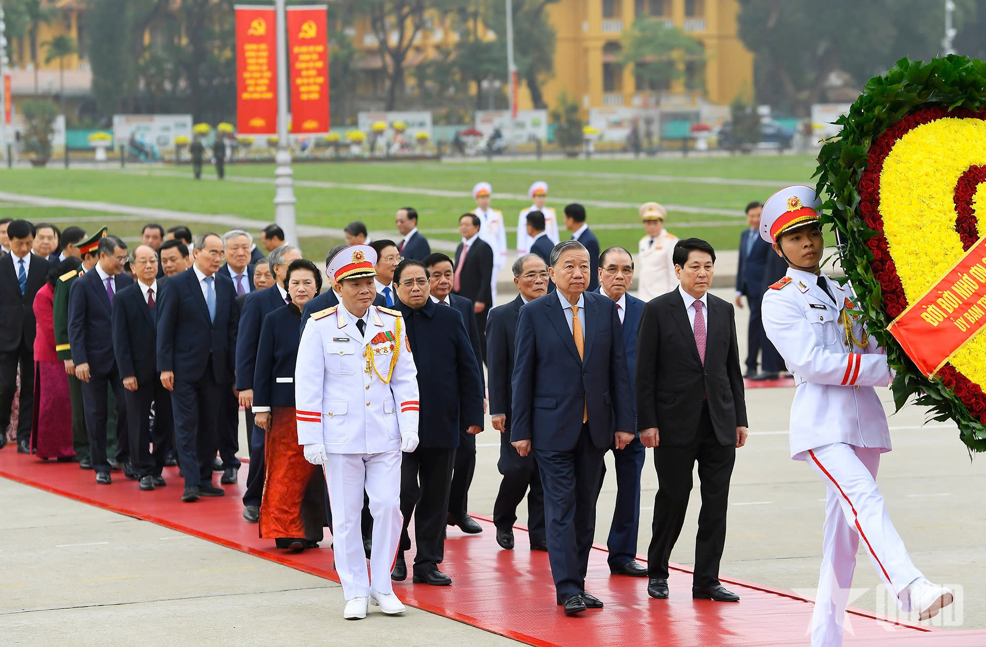 Đoàn đại biểu lãnh đạo, nguyên lãnh đạo Đảng, Nhà nước, Mặt trận Tổ quốc Việt Nam đặt vòng hoa, vào Lăng viếng Chủ tịch Hồ Chí Minh.