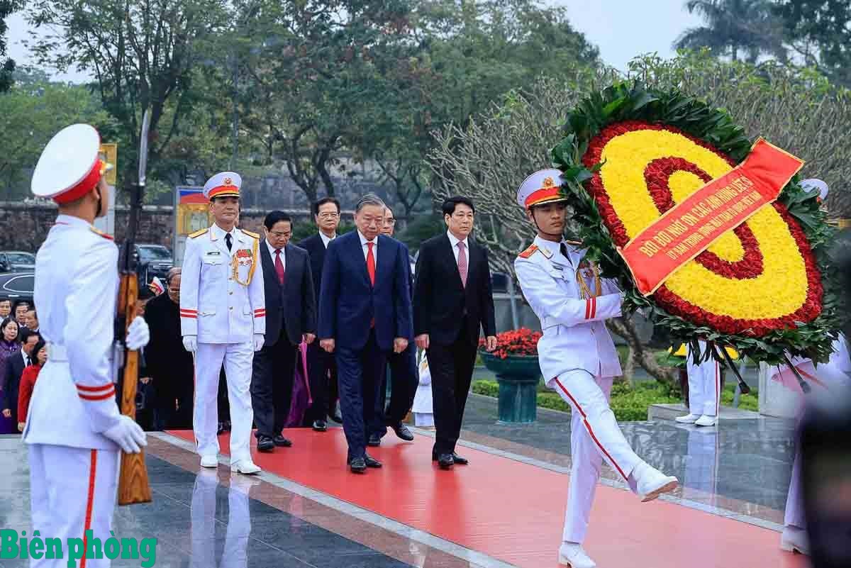 Đoàn đại biểu lãnh đạo Đảng, Nhà nước đến đặt vòng hoa, tưởng nhớ các Anh hùng, liệt sĩ. Ảnh: Hồng Pha