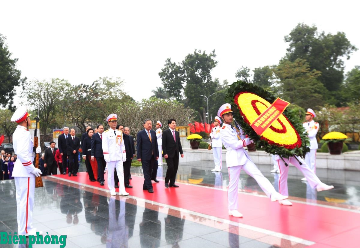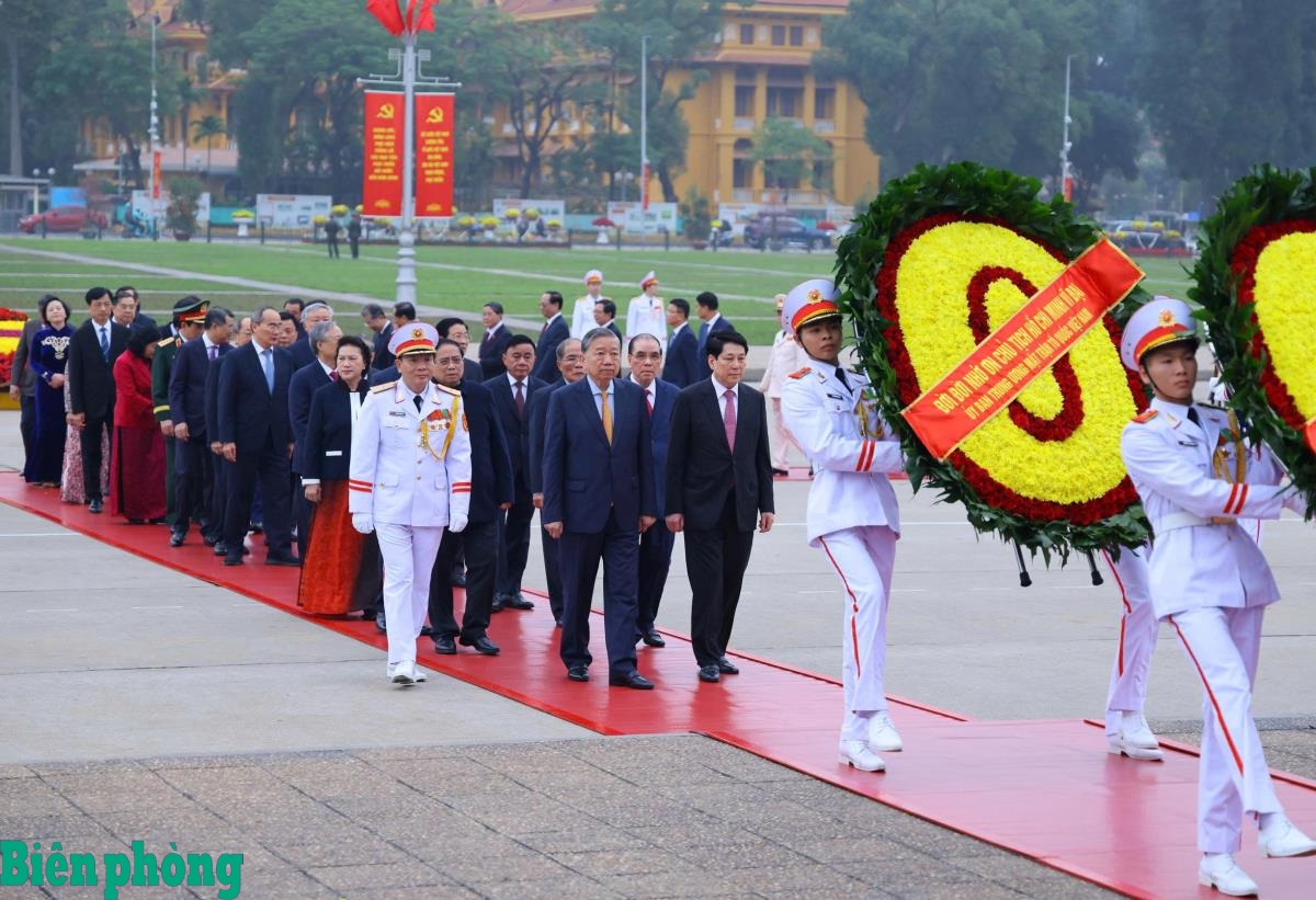 Đoàn đại biểu lãnh đạo, nguyên lãnh đạo Đảng, Nhà nước đến đặt vòng hoa, vào Lăng viếng Chủ tịch Hồ Chí Minh. Ảnh: Hồng Pha
