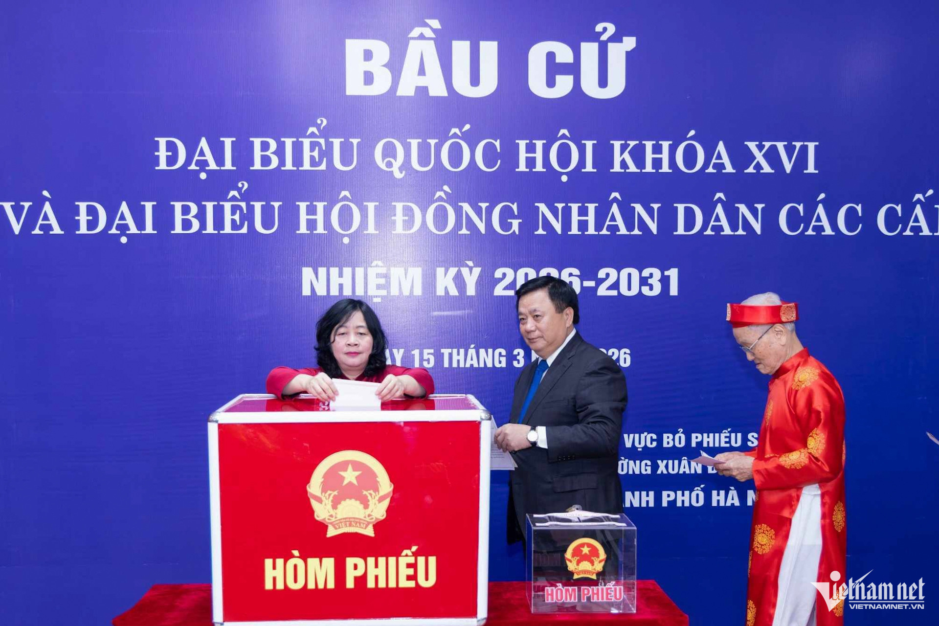 Chủ tịch Ủy ban Trung ương MTTQ Việt Nam Bùi Thị Minh Hoài, ông Nguyễn Xuân Thắng - Chủ tịch Hội đồng Lý luận Trung ương cùng cử tri bỏ phiếu