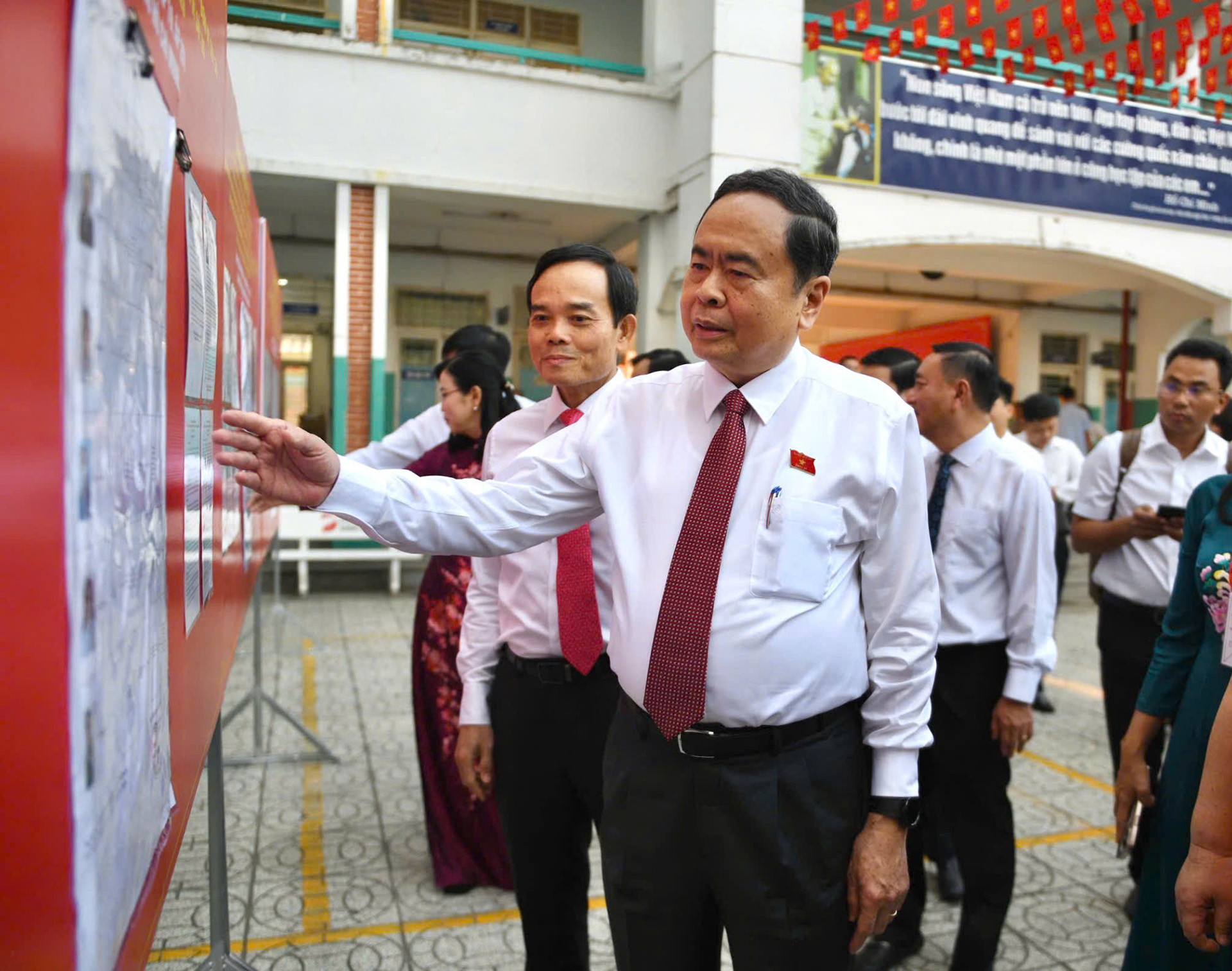 Chủ tịch Quốc hội Trần Thanh Mẫn kiểm tra công tác tổ chức bầu cử tại Khu vực bỏ phiếu số 14, Trường THCS Đỗ Văn Dậy, xã Hóc Môn