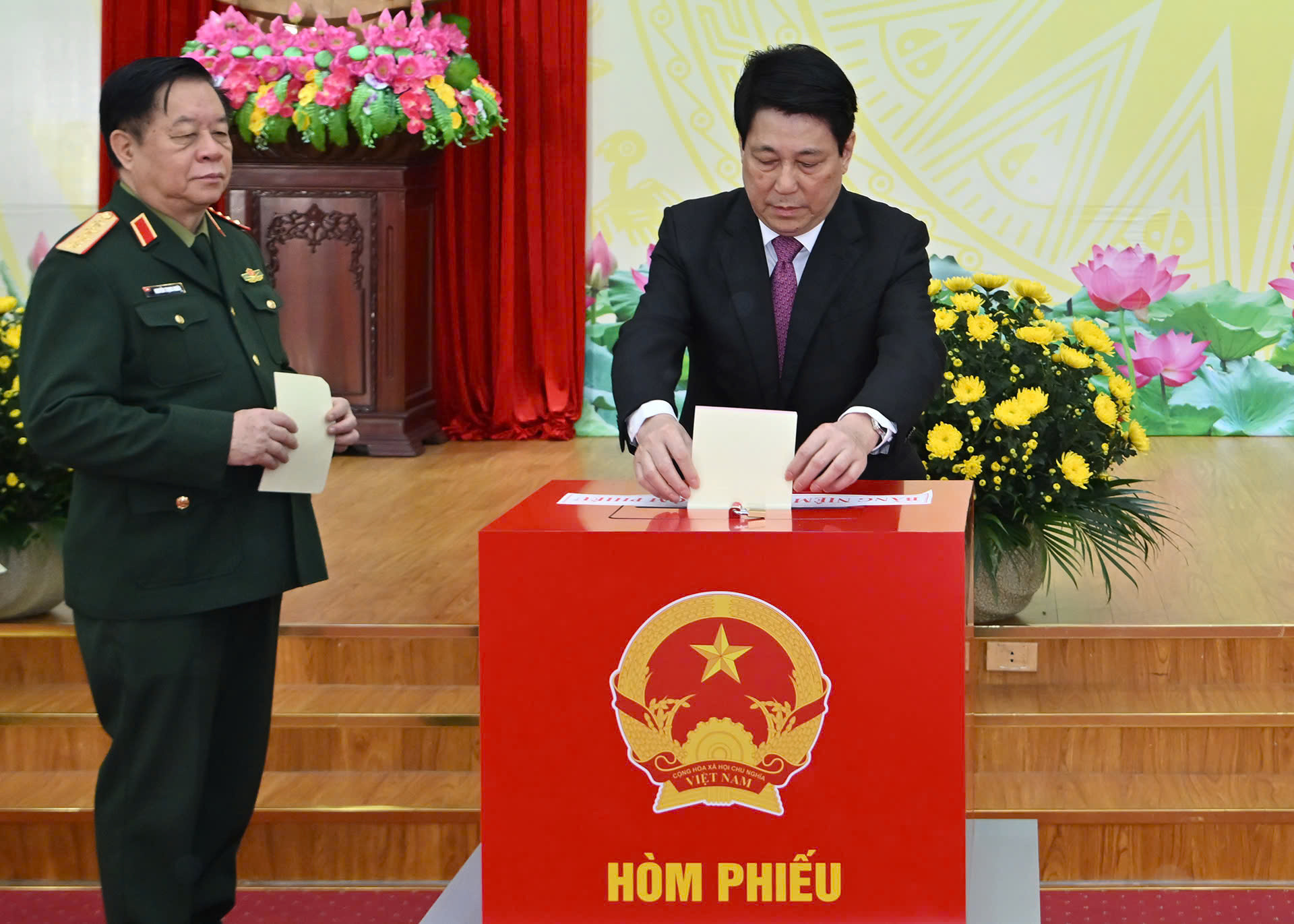 Tại khu vực bầu cử số 26, phường Hoàn Kiếm, Hà Nội, Chủ tịch nước Lương Cường tiến hành bỏ phiếu bầu cử.