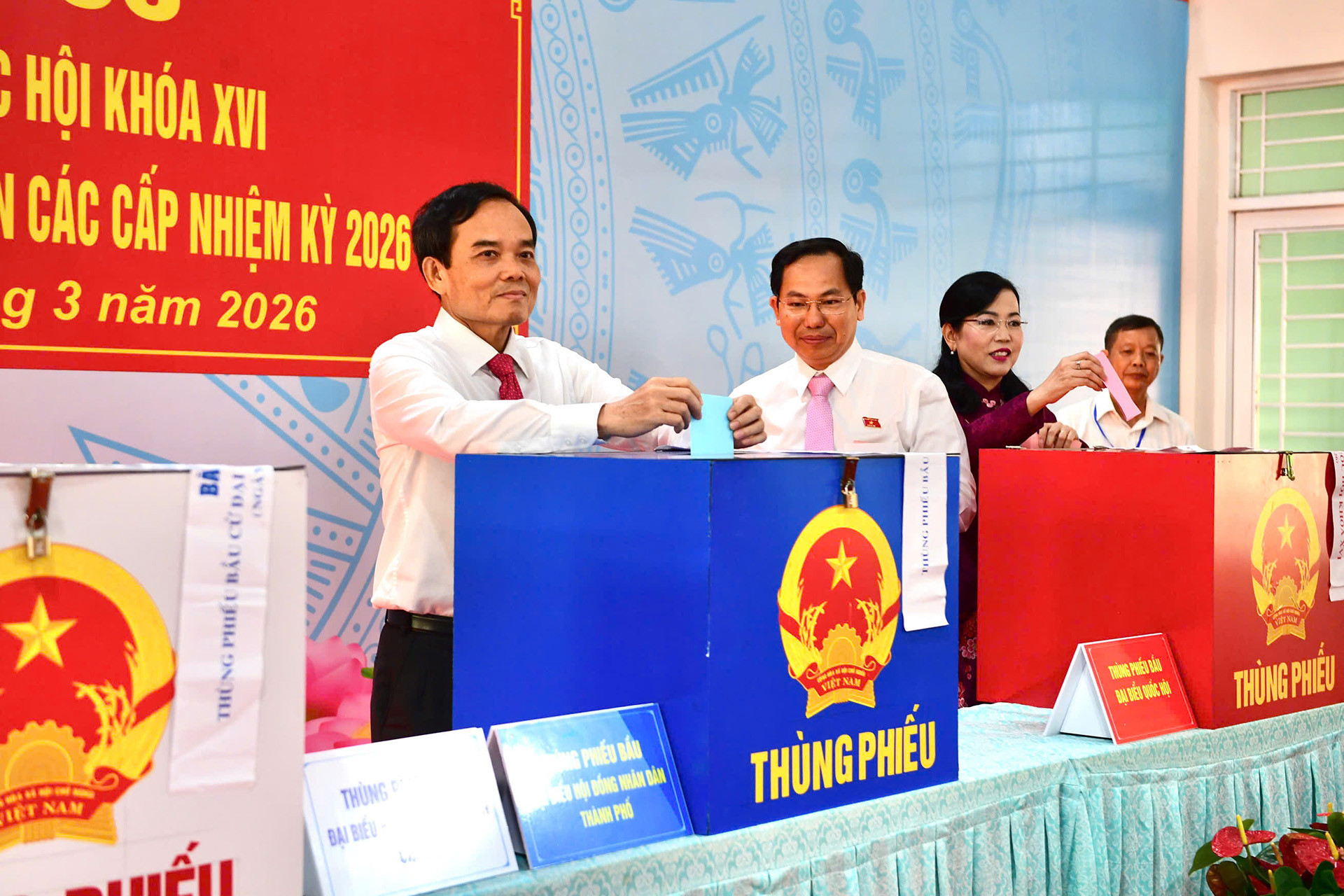 Chủ tịch Quốc hội Trần Thanh Mẫn bày tỏ vui mừng, vinh dự được đến xã Hóc Môn trực tiếp bỏ phiếu bầu cử đại biểu Quốc hội, đại biểu HĐND các cấp nhiệm kỳ 2026 - 2031.