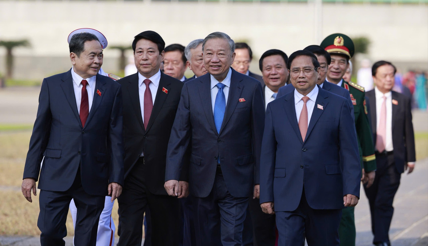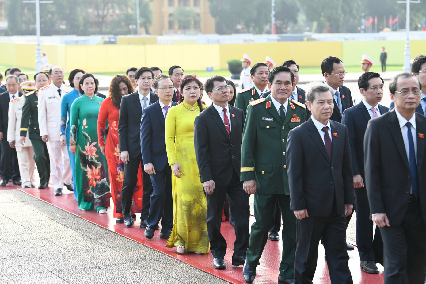 Tổng Bí thư Tô Lâm và lãnh đạo Đảng, Nhà nước, Mặt trận Tổ quốc Việt Nam, các đại biểu Quốc hội vào Lăng viếng Chủ tịch Hồ Chí Minh. Ảnh: Quốc hội