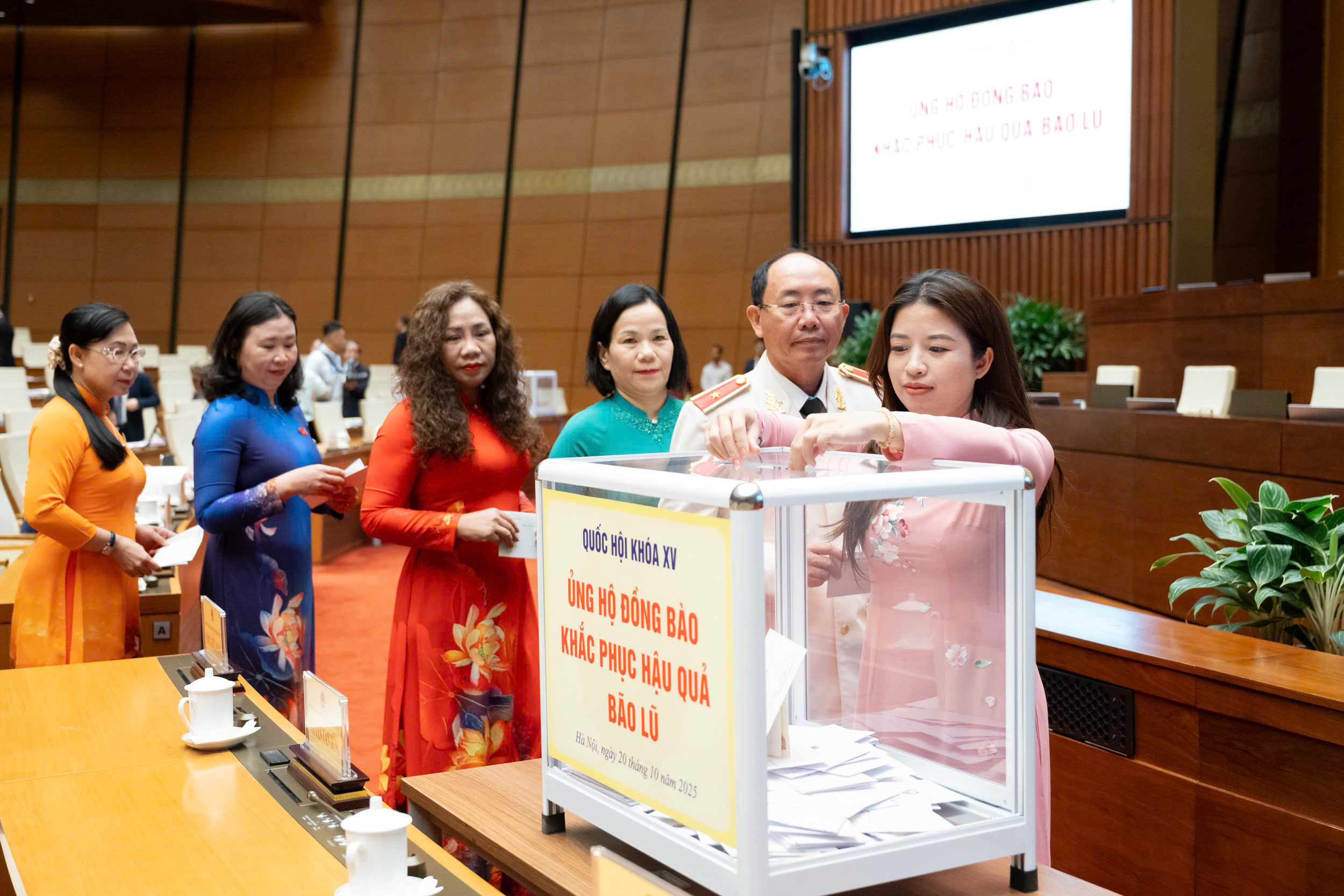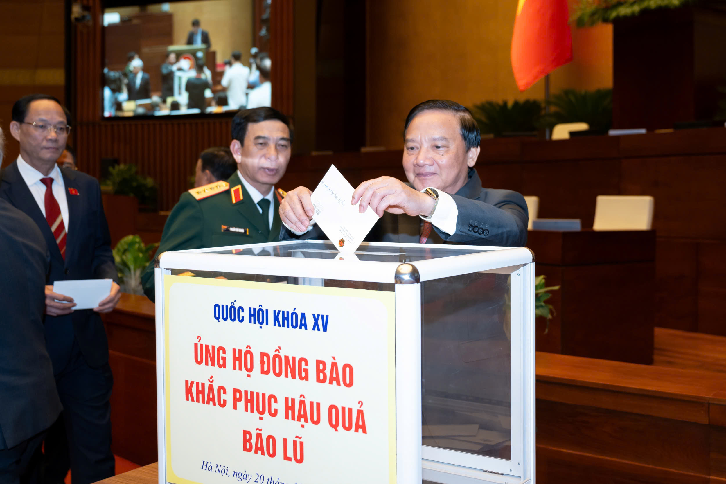 Trước khi bắt đầu phiên khai mạc Kỳ họp thứ 10, lãnh đạo Đảng, Nhà nước, đại biểu Quốc hội các tỉnh, thành phố đã ủng hộ đồng bào, khắc phục hậu quả bão lũ.