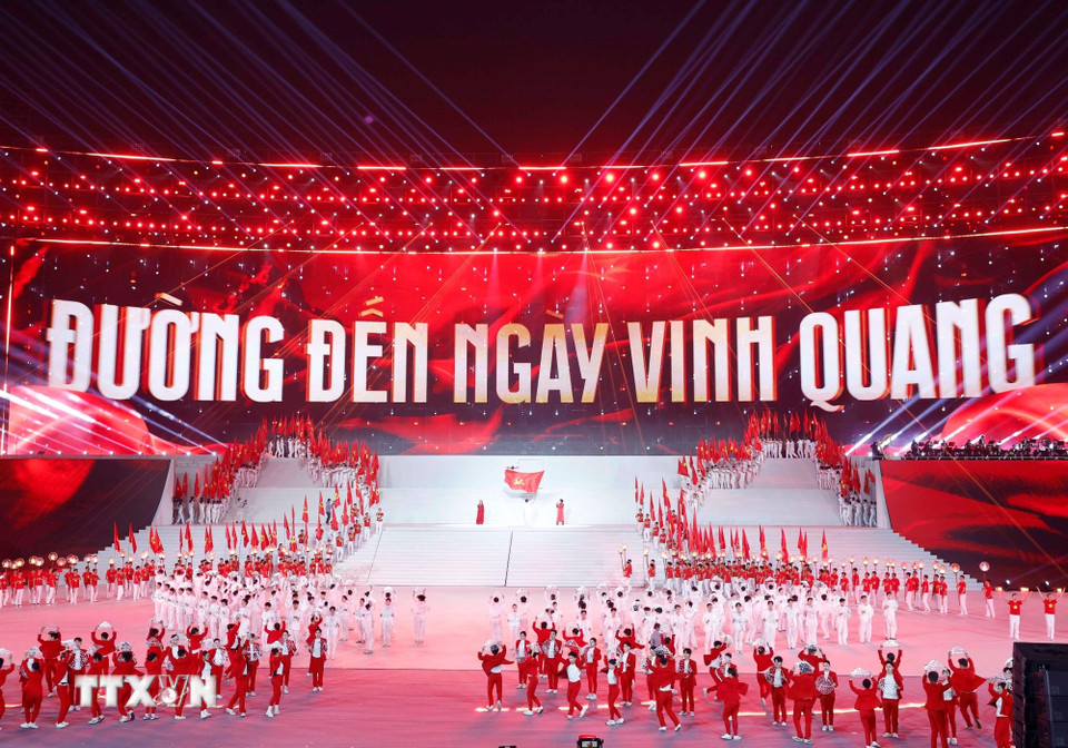 Chương trình nghệ thuật đặc biệt "Dưới lá cờ vẻ vang của Đảng” do Thành ủy, Hội đồng nhân dân, Ủy ban Mặt trận Tổ quốc Việt Nam Thành phố Hà Nội tổ chức. (Ảnh: TTXVN)