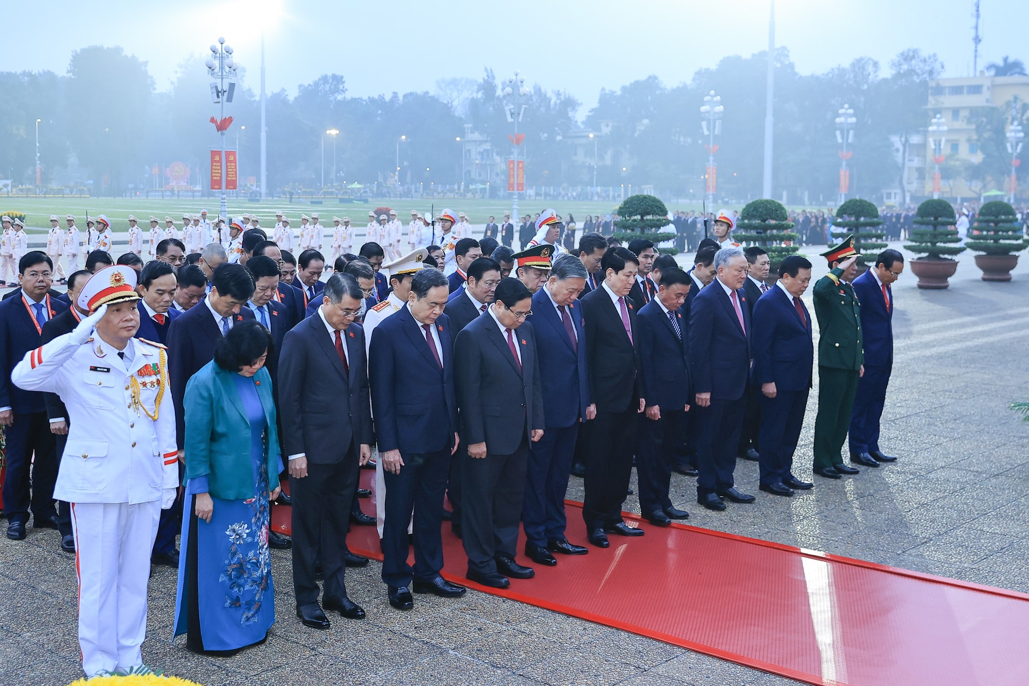 Trong không khí trang nghiêm, xúc động, Tổng Bí thư Tô Lâm và Chủ tịch nước Lương Cường, Thủ tướng Chính phủ Phạm Minh Chính, Chủ tịch Quốc hội Trần Thanh Mẫn, Thường trực Ban Bí thư Trần Cẩm Tú cùng các đại biểu đã thành kính bày tỏ lòng biết ơn vô hạn đối với lãnh tụ kính yêu của dân tộc Việt Nam - Người đã hiến dâng cả cuộc đời mình vì độc lập của Tổ quốc và tự do, hạnh phúc của nhân dân, Người đã đặt nền tảng tư tưởng cho sự nghiệp cách mạng của Đảng, đưa đất nước vững bước trên con đường đổi mới, tiến lên chủ nghĩa xã hội.
