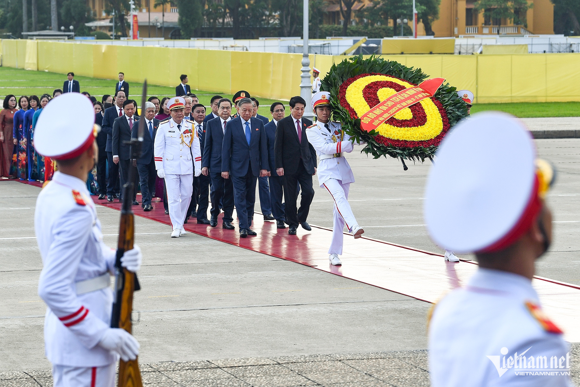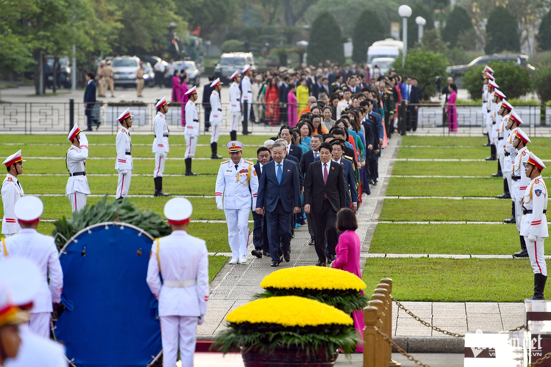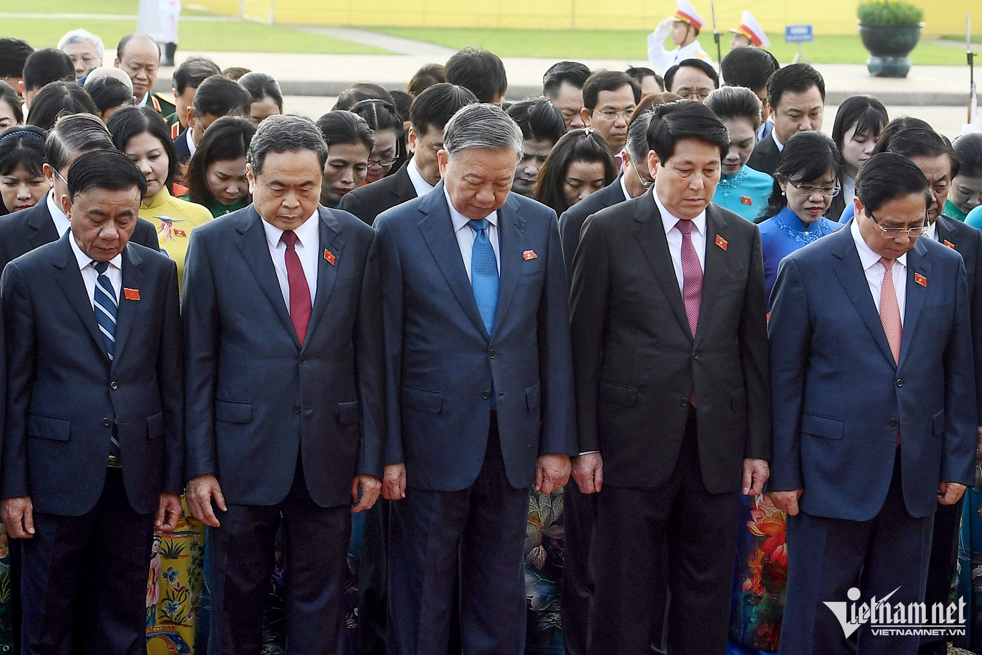 Dự lễ viếng có Tổng Bí thư Tô Lâm, Chủ tịch nước Lương Cường, Thủ tướng Phạm Minh Chính, Chủ tịch Quốc hội Trần Thanh Mẫn, Thường trực Ban Bí thư Trần Cẩm Tú cùng các đại biểu Quốc hội khóa 15.
