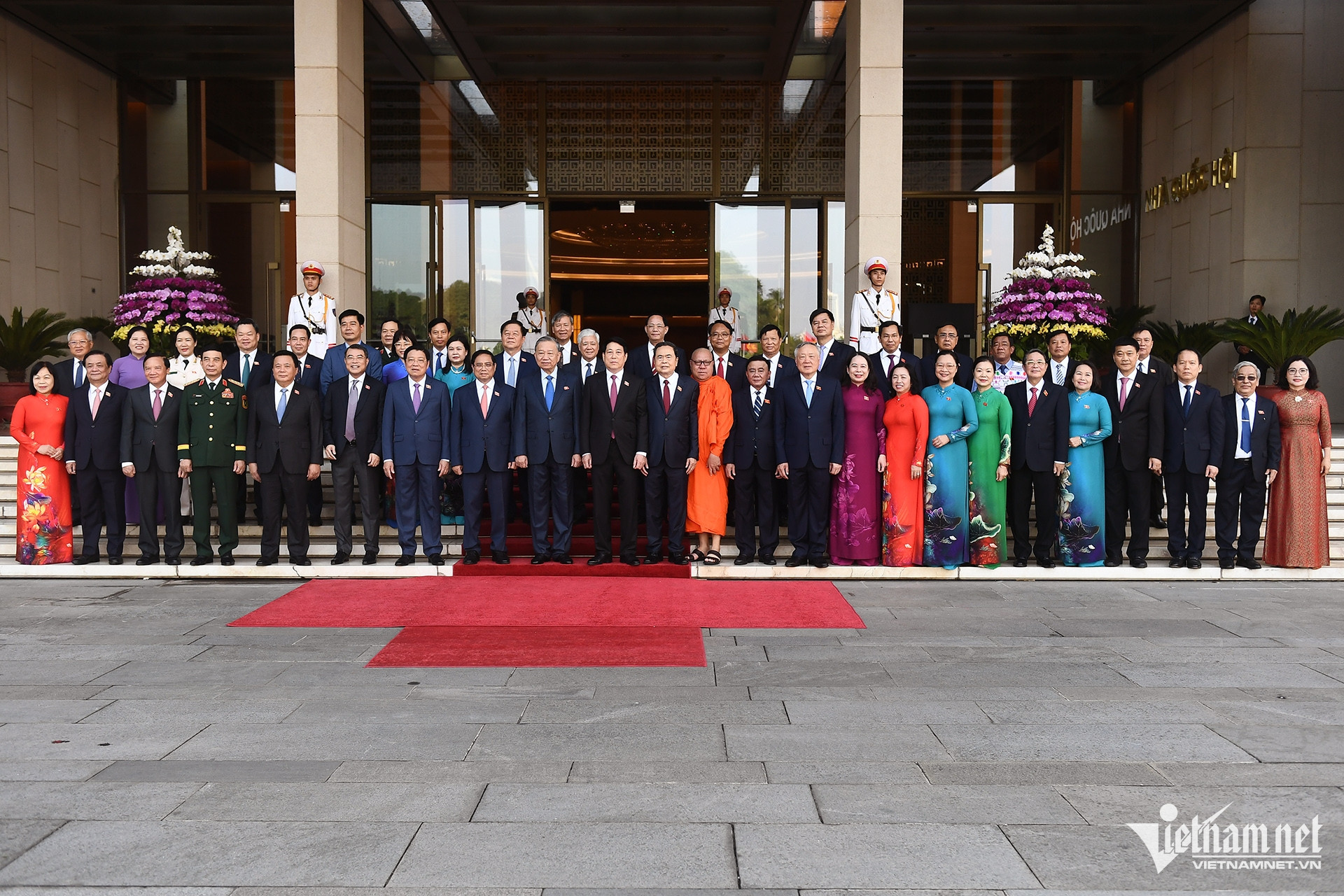 Kết thúc lễ viếng, các lãnh đạo Đảng và Nhà nước chụp ảnh lưu niệm trước sảnh Tòa nhà Quốc hội chuẩn bị dự phiên họp trù bị trước khai mạc.