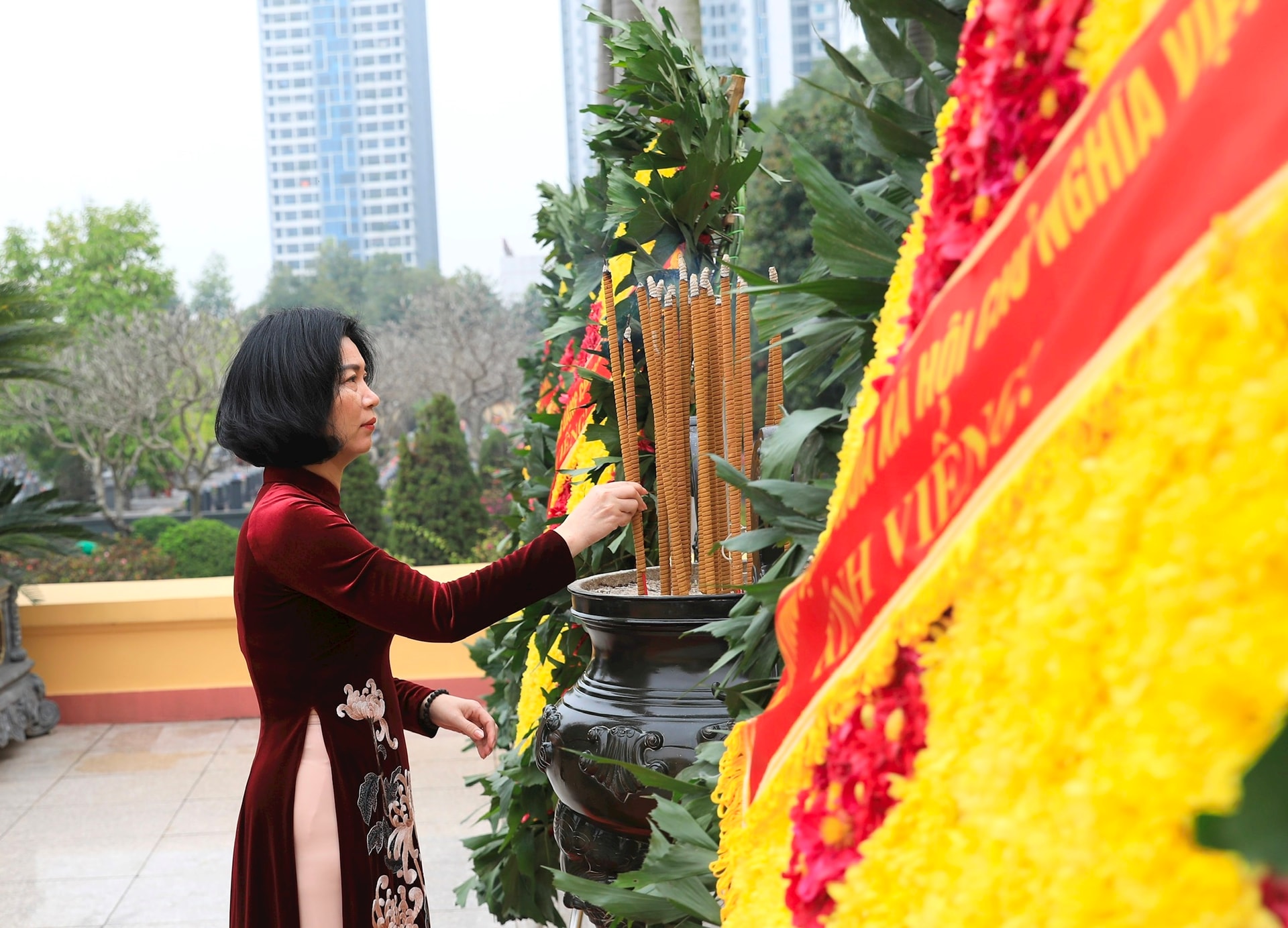 Chủ tịch HĐND thành phố Hà Nội Phùng Thị Hồng Hà dâng hương tưởng nhớ các đồng chí lãnh đạo Đảng, Nhà nước và các Anh hùng liệt sĩ an nghỉ tại Nghĩa trang Mai Dịch. Ảnh: Viết Thành