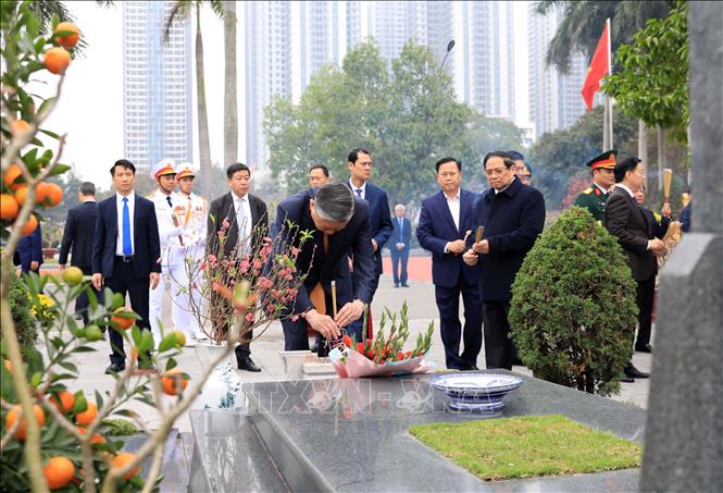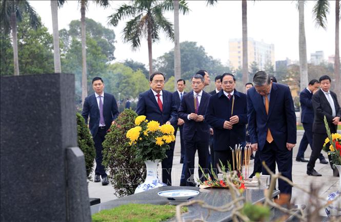 Đoàn đại biểu lãnh đạo Đảng, Nhà nước, Ủy ban Trung ương Mặt trận Tổ quốc Việt Nam dâng hương tưởng niệm các vị tiền bối cách mạng và các Anh hùng, liệt sỹ tại Nghĩa trang Mai Dịch. Ảnh: Văn Điệp/TTXVN