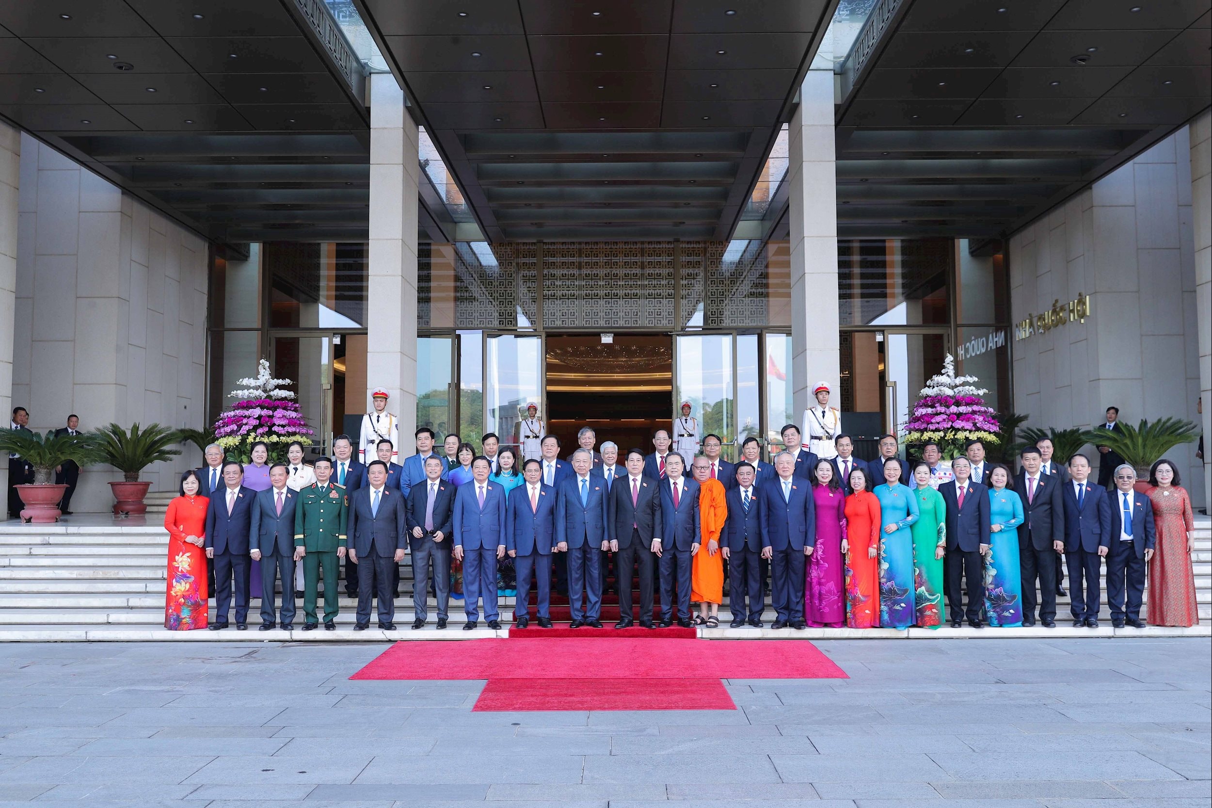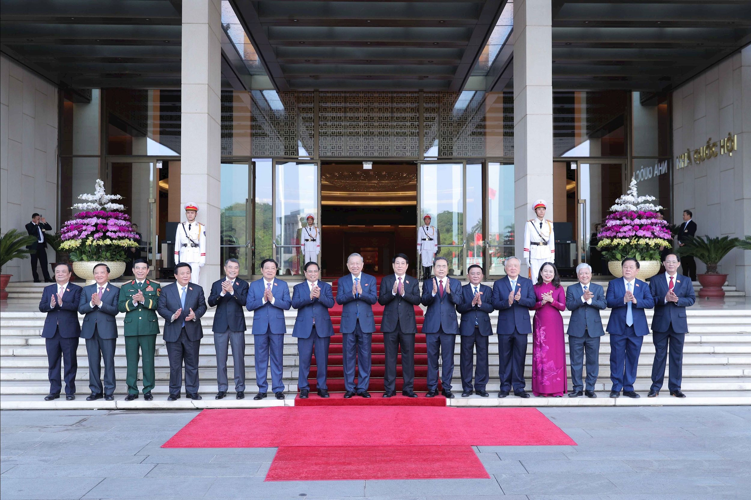 Lãnh đạo Đảng, Nhà nước tại Nhà Quốc hội trước giờ khai mạc Kỳ họp thứ Mười, Quốc hội khóa XV. Ảnh: Hồ Long