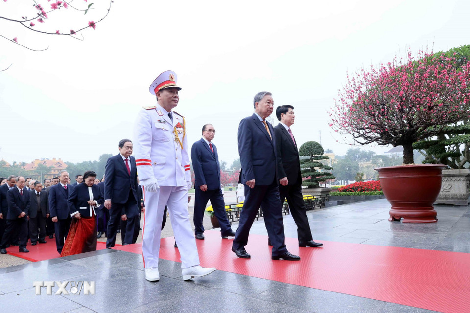 Nhân dịp Tết Nguyên đán Bính Ngọ 2026, sáng 13/2/2026, Đoàn đại biểu Ban Chấp hành Trung ương Đảng, Chủ tịch nước, Quốc hội, Chính phủ, Ủy ban Trung ương Mặt trận Tổ quốc Việt Nam, các Bộ, ban, ngành và thành phố Hà Nội đến đặt vòng hoa và vào Lăng viếng Chủ tịch Hồ Chí Minh. (Ảnh: An Đăng/TTXVN)