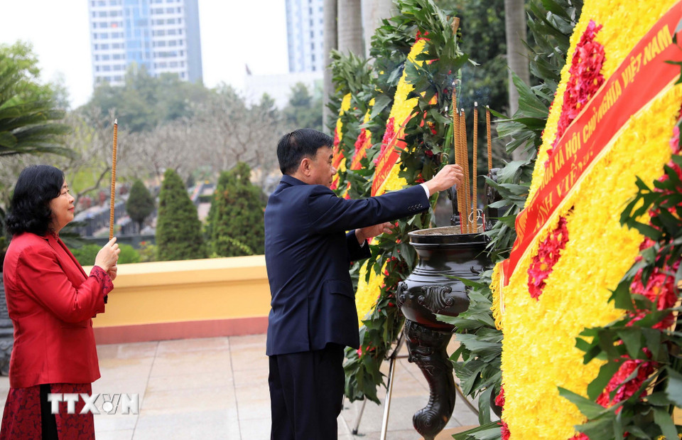 Đoàn đại biểu lãnh đạo Đảng, Nhà nước, Ủy ban Trung ương Mặt trận Tổ quốc Việt Nam dâng hương tưởng niệm các vị tiền bối cách mạng và các Anh hùng, liệt sỹ tại Nghĩa trang Mai Dịch. (Ảnh: Văn Điệp/TTXVN)