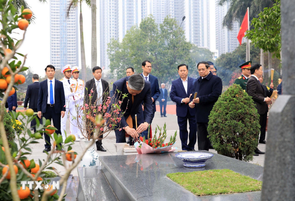 Thủ tướng Phạm Minh Chính dâng hương tưởng niệm các vị tiền bối cách mạng và các Anh hùng, Liệt sỹ tại Nghĩa trang Mai Dịch, Hà Nội. (Ảnh: Văn Điệp/TTXVN)