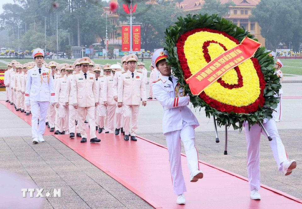 Đoàn đại biểu Đảng ủy Công an Trung ương, Bộ Công an đến đặt vòng hoa và vào Lăng viếng Chủ tịch Hồ Chí Minh.