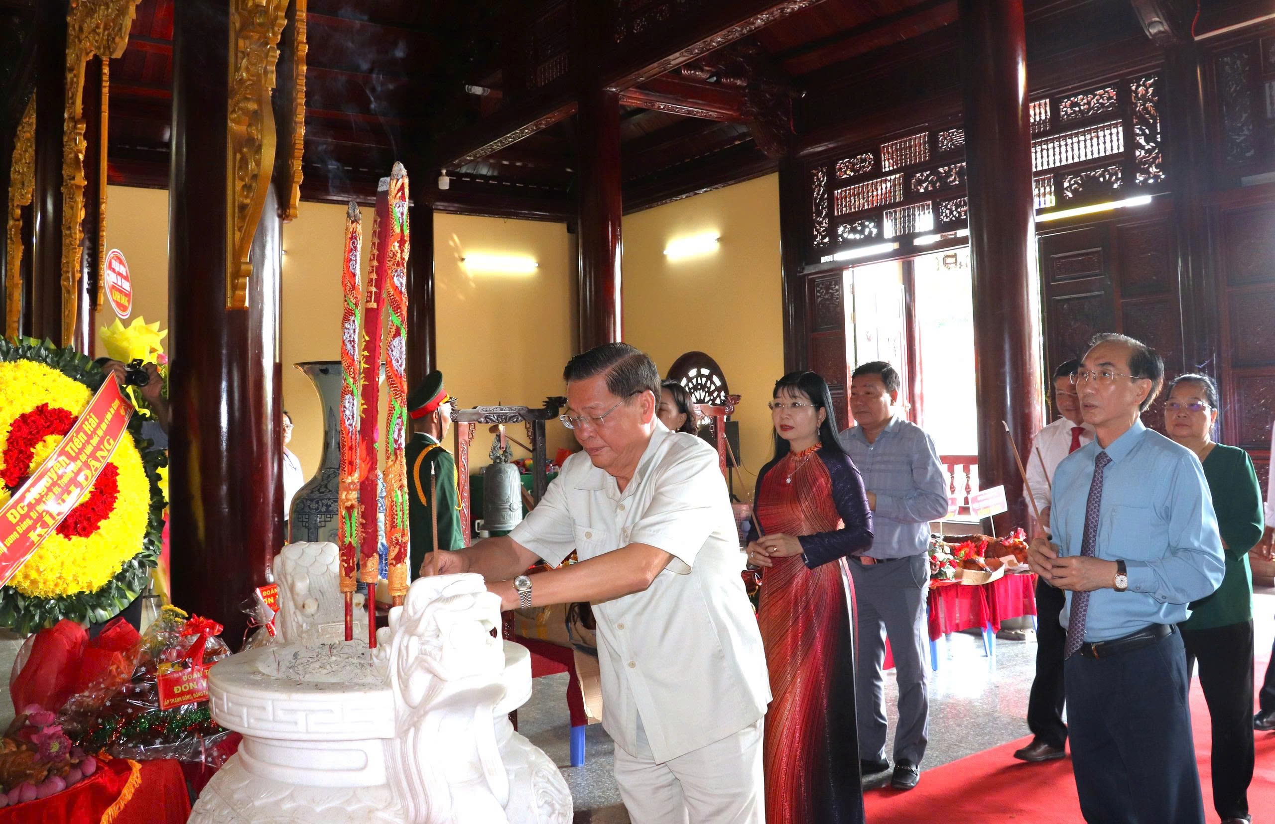 Các đồng chí lãnh đạo, nguyên lãnh đạo tỉnh An Giang đến dâng hương tại Đền thờ Quốc Tổ Hùng Vương ở xã Tân Hiệp (tỉnh An Giang). Ảnh: Phương Vũ