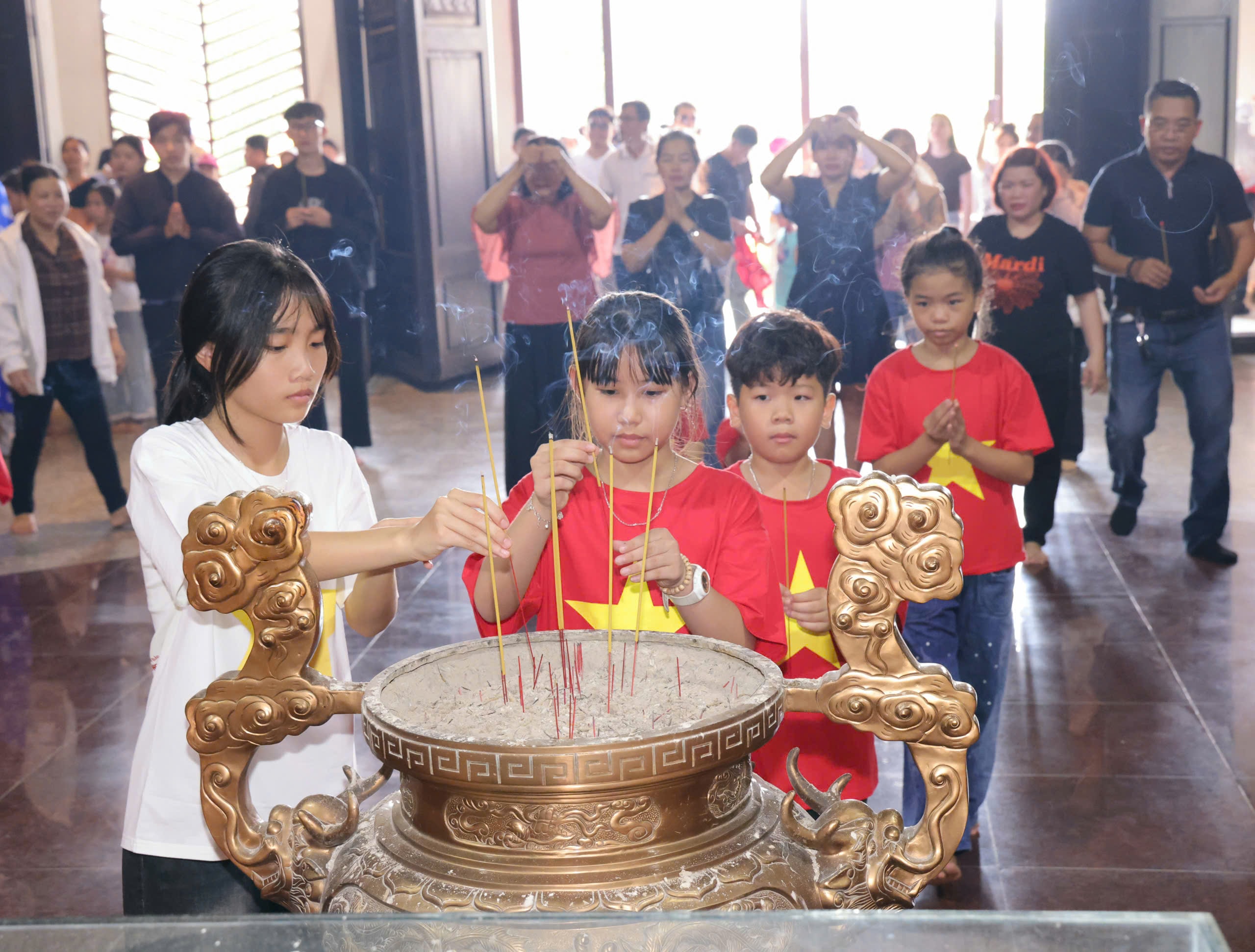 Các em nhỏ cũng đến thắp hương, kính viếng các Vua Hùng. Ảnh: Phạm Trung