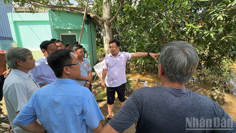 Bí thư Đảng ủy phường Sa Đéc (thứ 2 từ phải qua) Nguyễn Phước Thiện chỉ đạo các ngành triển khai ngay phương án khắc phục các đoạn đê bị vỡ.