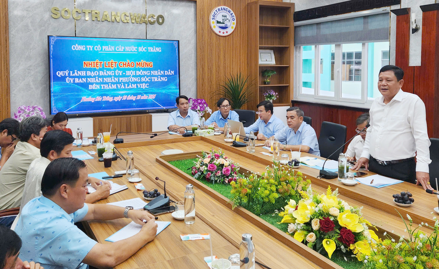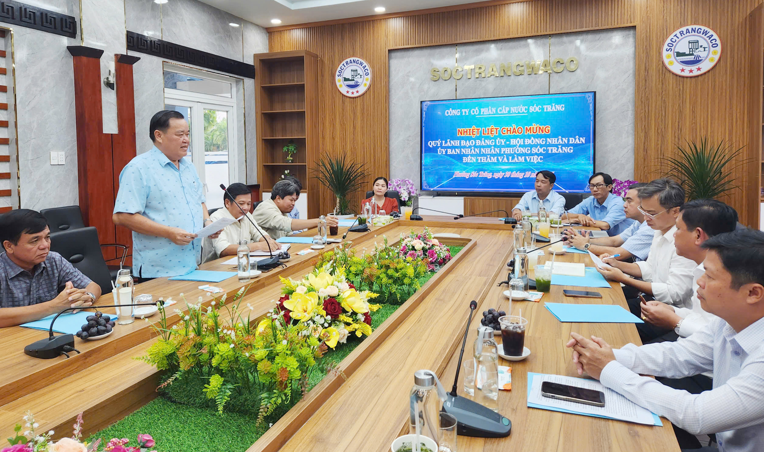 Trình bày với đoàn công tác, Tổng giám đốc SocTrangWaco Đặng Văn Ngọ cho biết đơn vị này đang quản lý và khai thác hệ thống cấp nước đô thị gồm 23 nhà máy và trạm khai thác xử lý nước. Trong đó, tại phường Sóc Trăng và phường Phú Lợi có 6 nhà máy và trạm cấp nước, khai thác 24 giếng nước ngầm và một nhà máy nước mặt đặt tại Khu công nghiệp An Nghiệp, cung cấp cho gần 49.000 hộ khách hàng.