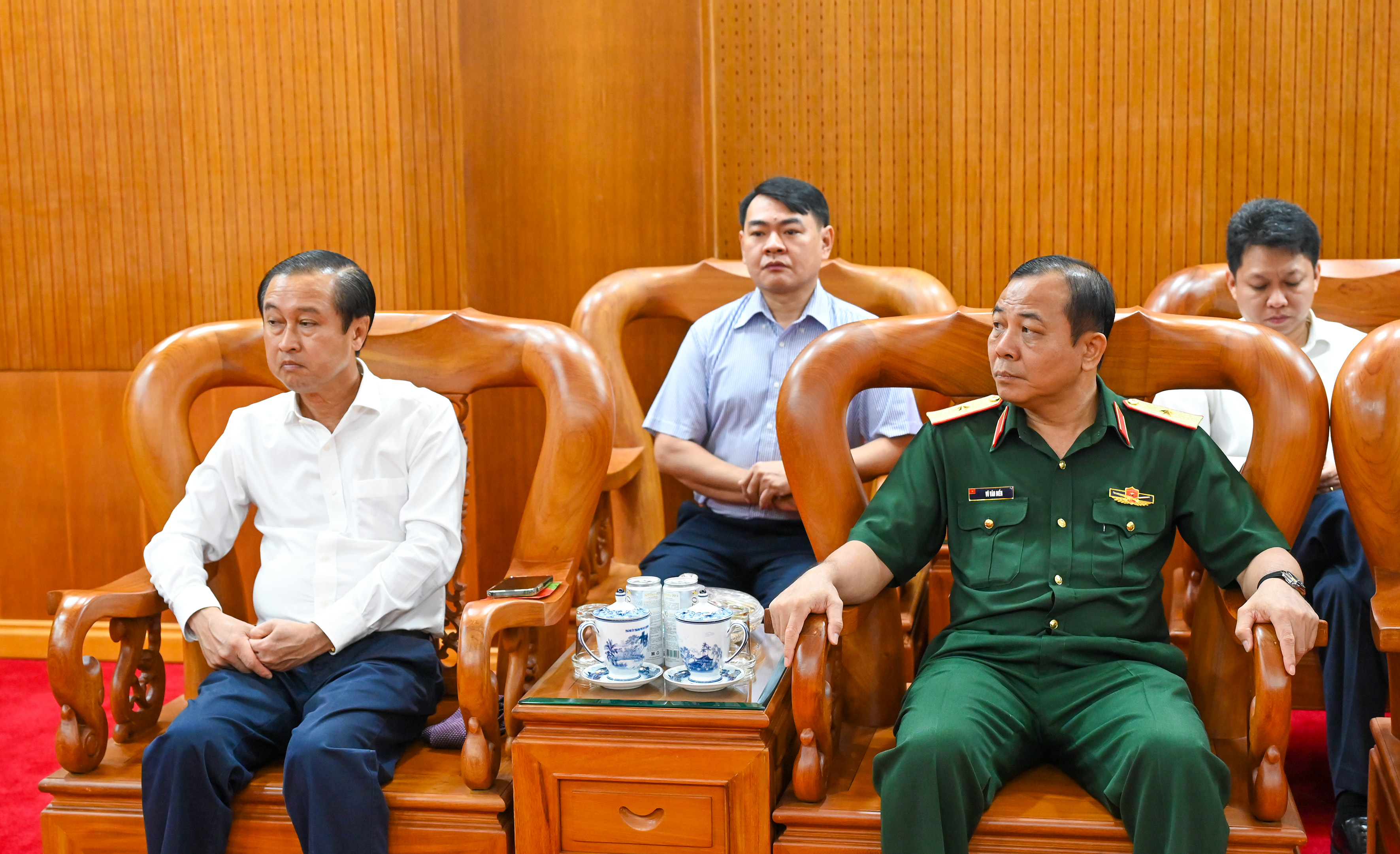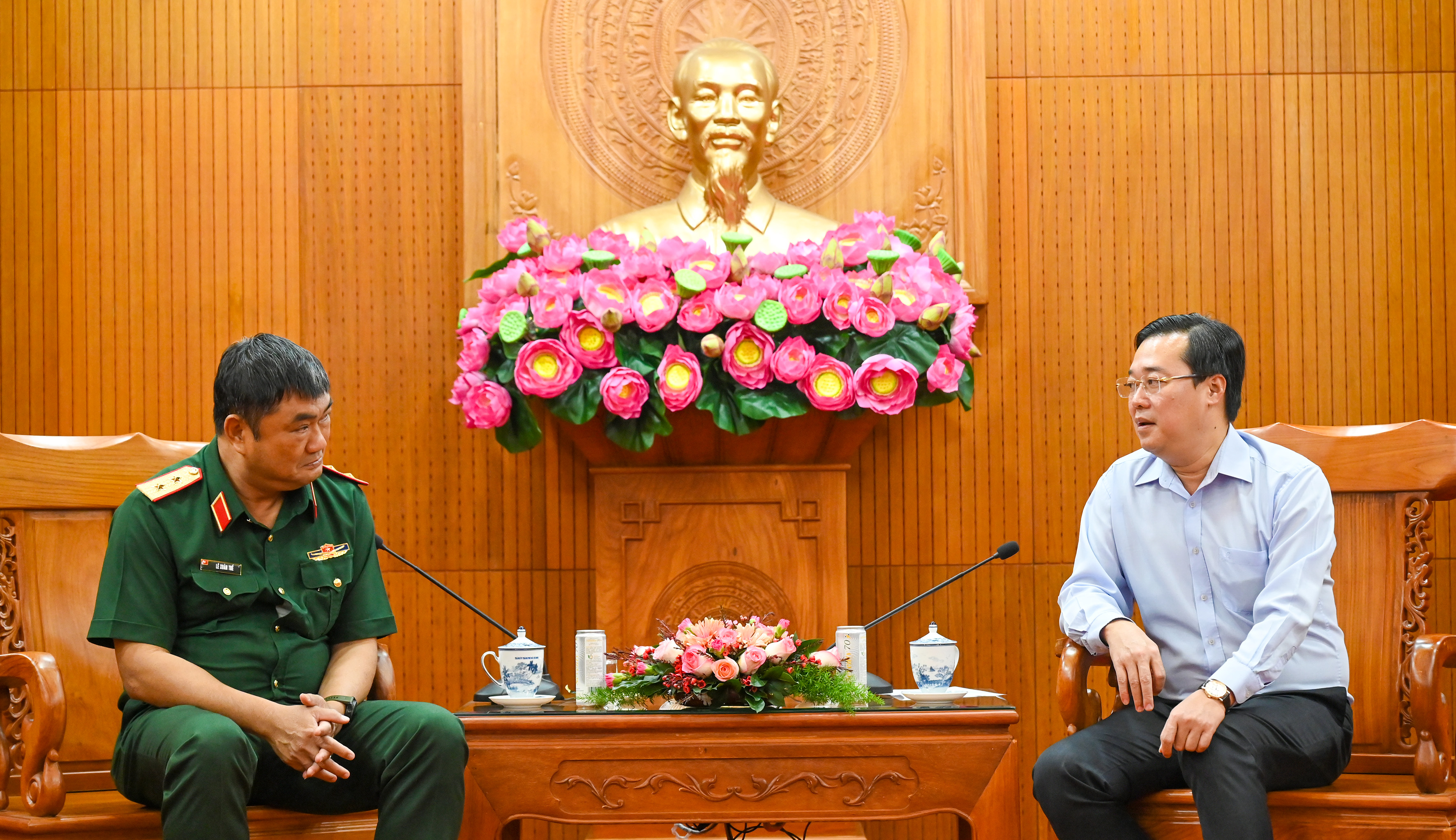 Đồng chí Lê Quốc Phong, Ủy viên Trung ương Đảng, Phó Bí thư Thường trực Thành ủy TPHCM trao đổi với Thủ trưởng Bộ Tư lệnh Quân khu 7