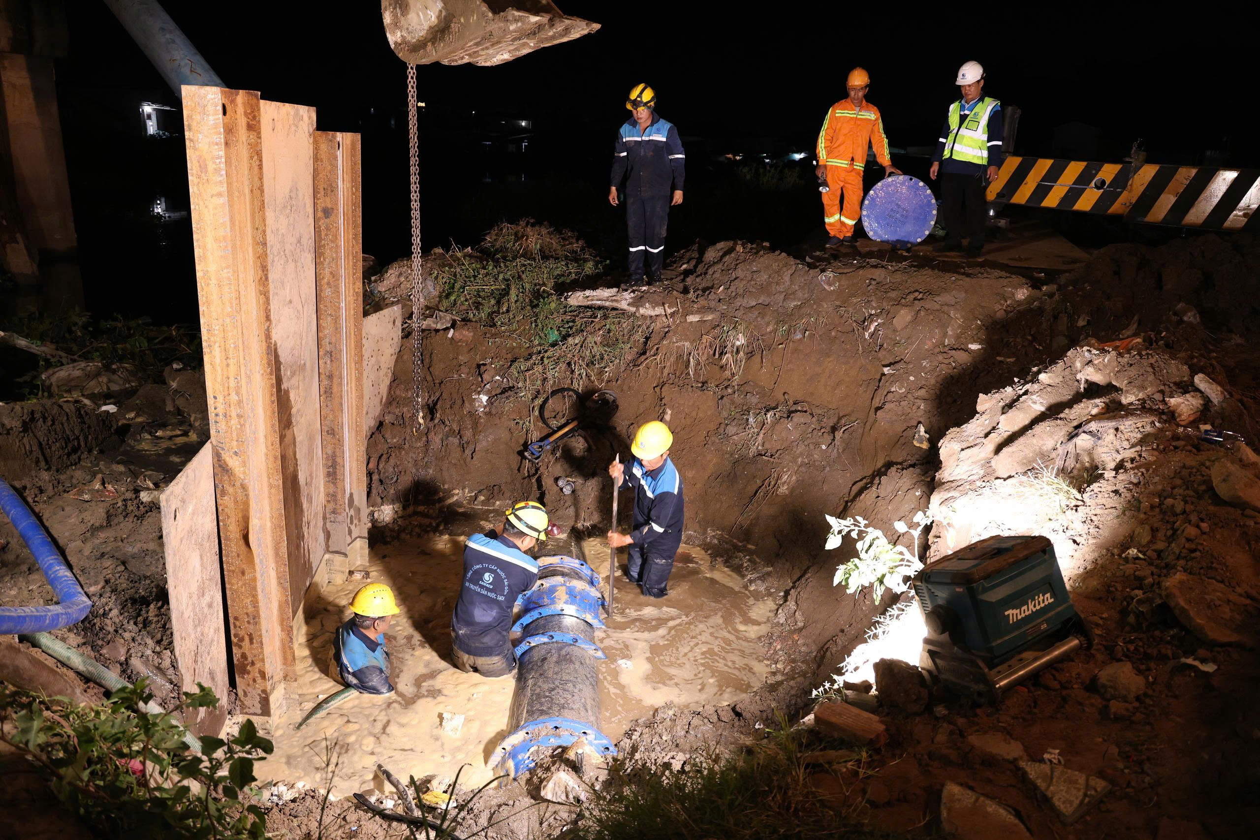 Công nhân Sawaco làm đêm tại công trình bít tạm tuyến ống cấp nước DN500, phục vụ thi công Dự án xây dựng hạ tầng và cải tạo môi trường kênh Tham Lương, Bến Cát, Rạch Nước Lên.