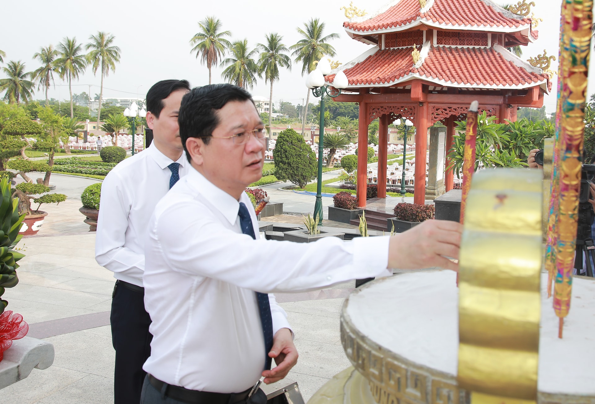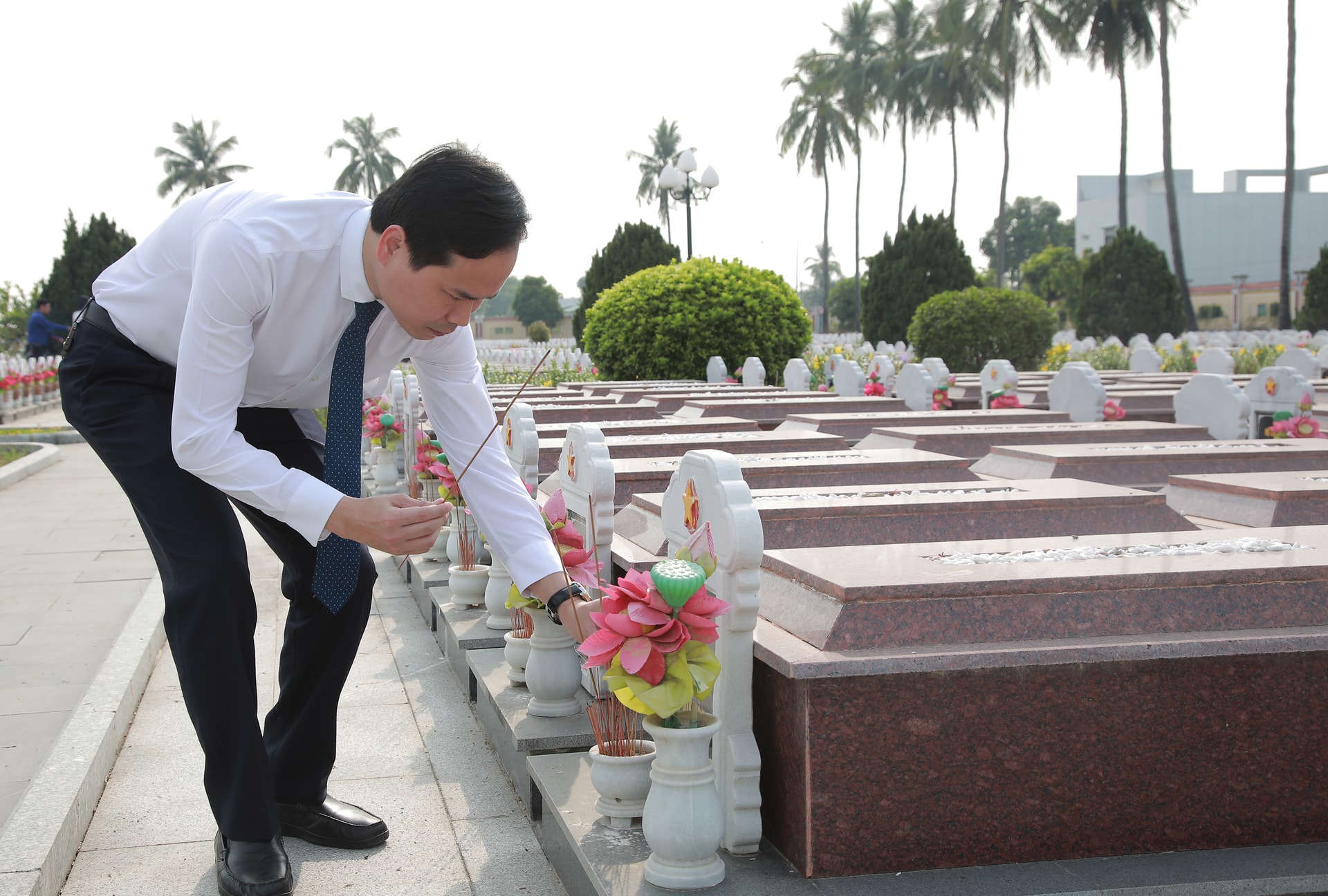 Phó Chủ tịch UBND thành phố Phan Thái Bình thắp hương các mộ phần liệt sĩ. Ảnh: ĐẮC MẠNH