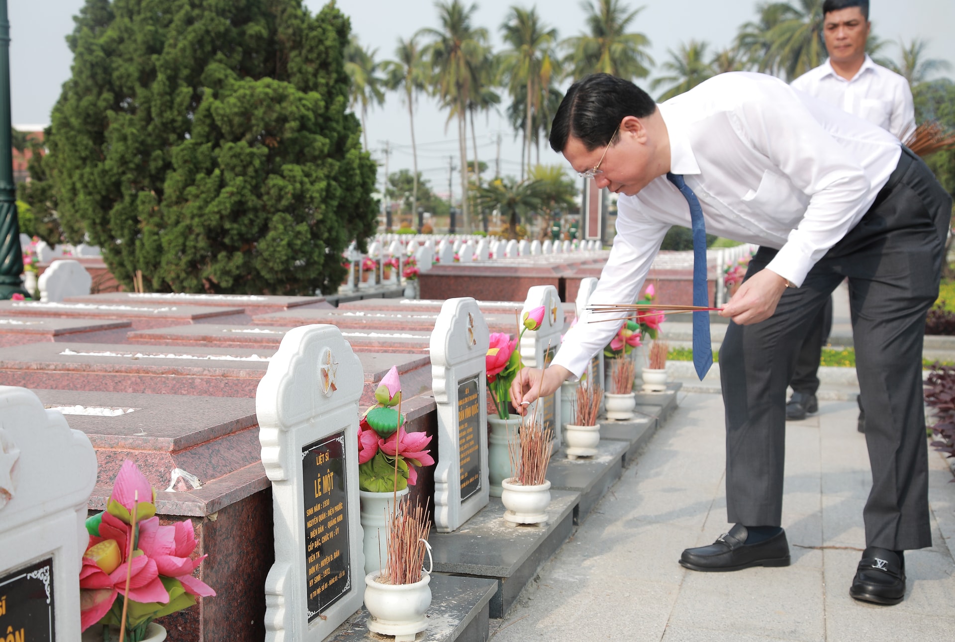 Phó Trưởng đoàn Đại biểu Quốc hội thành phố Đà Nẵng Nguyễn Duy Minh thắp hương các mộ phần liệt sĩ tại Nghĩa trang Liệt sĩ Điện Bàn. Ảnh: ĐẮC MẠNH