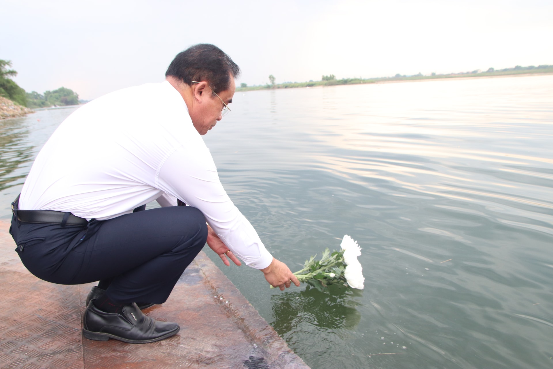 Phó Chủ tịch UBND thành phố Trần Anh Tuấn thả hoa tri ân các anh hùng liệt sĩ trên dòng sông Long Đại. Ảnh: TRỌNG HUY