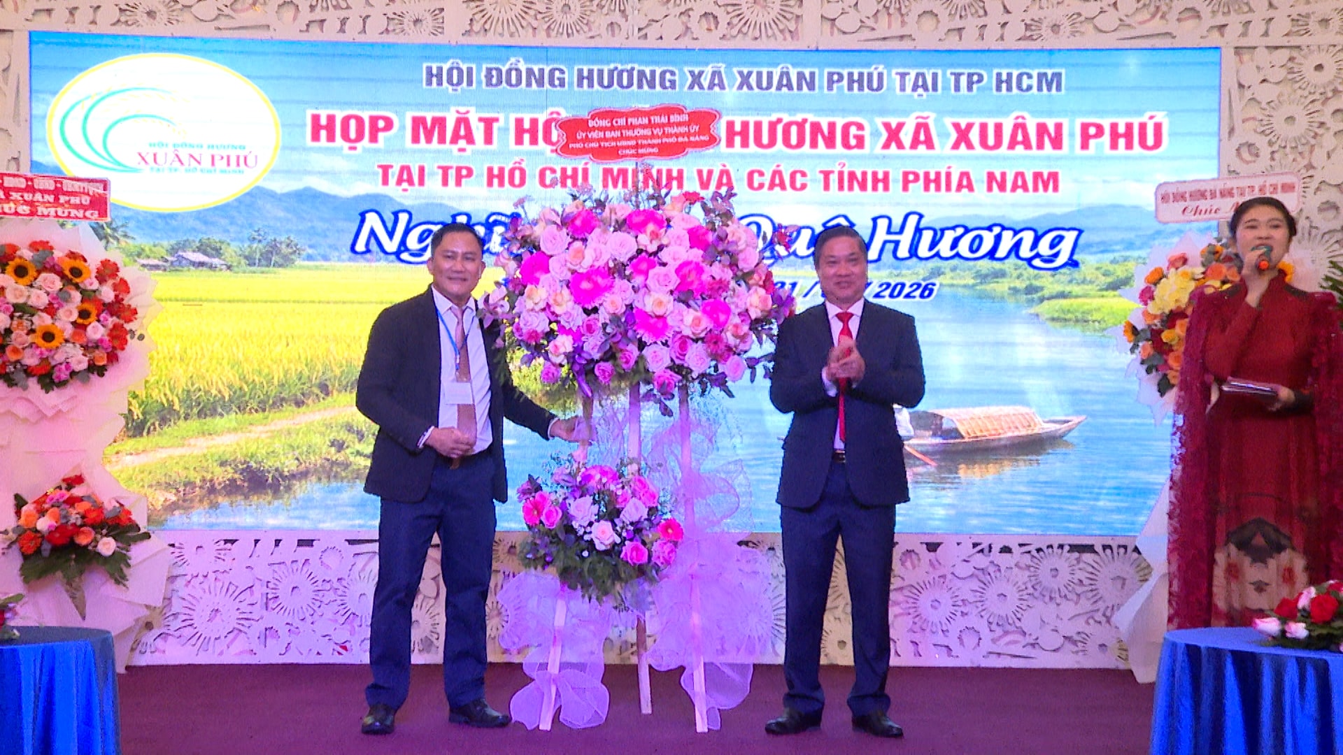 Phó Chủ tịch UBND thành phố Đà Nẵng Phan Thái Bình (bìa phải) tặng hoa chúc mừng lãnh đạo Hội đồng hương xã Xuân Phú tại Thành phố Hồ Chí Minh.