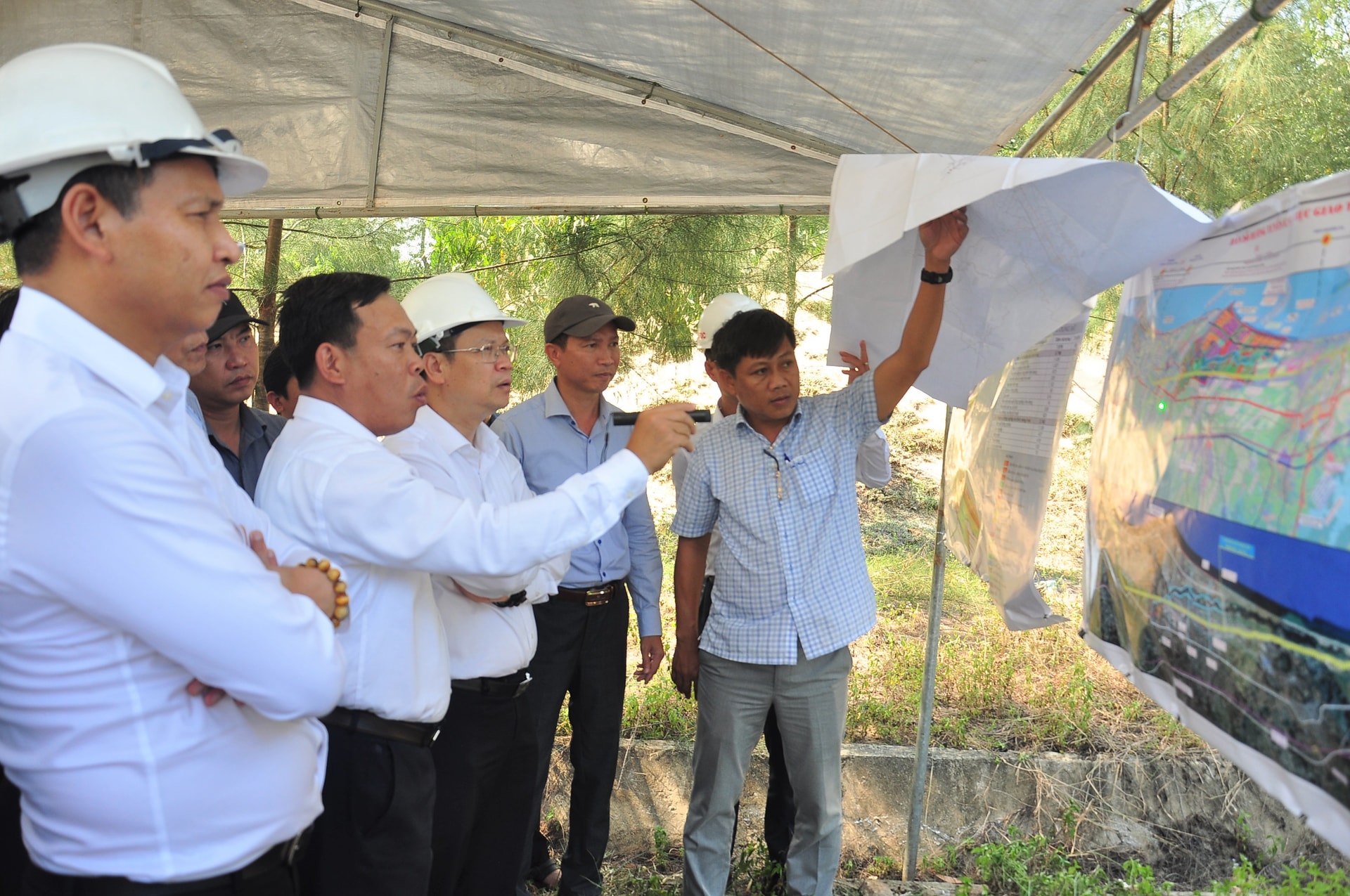 Phó Bí thư Thành ủy Nguyễn Mạnh Hùng (thứ 3, bên phải sang) và Phó Chủ tịch Thường trực UBND thành phố Hồ Kỳ Minh (ngoài cùng bên trái) nghe lãnh đạo xã Thăng An báo cáo về các dự án liên quan. Ảnh: VINH ANH