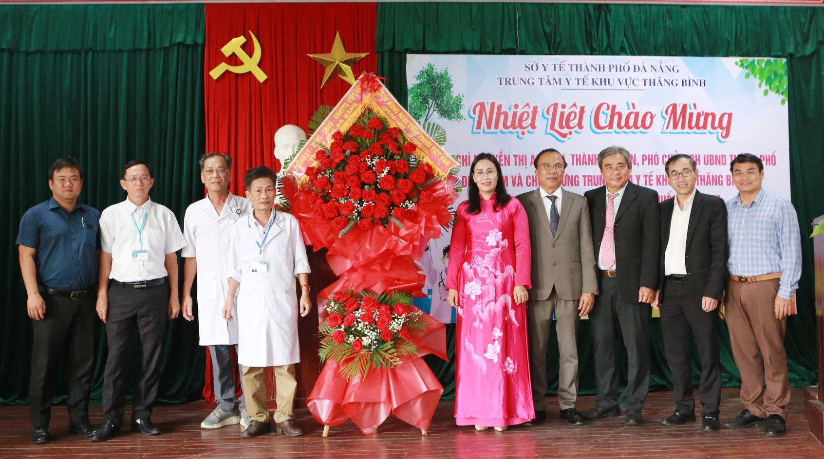 Phó Chủ tịch UBND thành phố Nguyễn Thị Anh Thi (thứ 5, bên phải sang) tặng hoa chúc mừng Trung tâm Y tế khu vực Thăng Bình nhân ngày Thầy thuốc Việt Nam. Ảnh: T.CÔNG