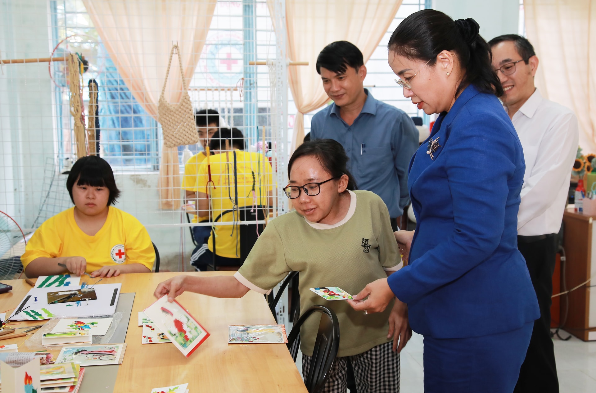 Phó Chủ tịch UBND thành phố Nguyễn Thị Anh Thi thăm khu vực làm tranh giấy quilling của hội viên Trung tâm chăm sóc người cao tuổi và người khuyết tật Chữ thập đỏ thành phố. Ảnh: ĐẮC MẠNH