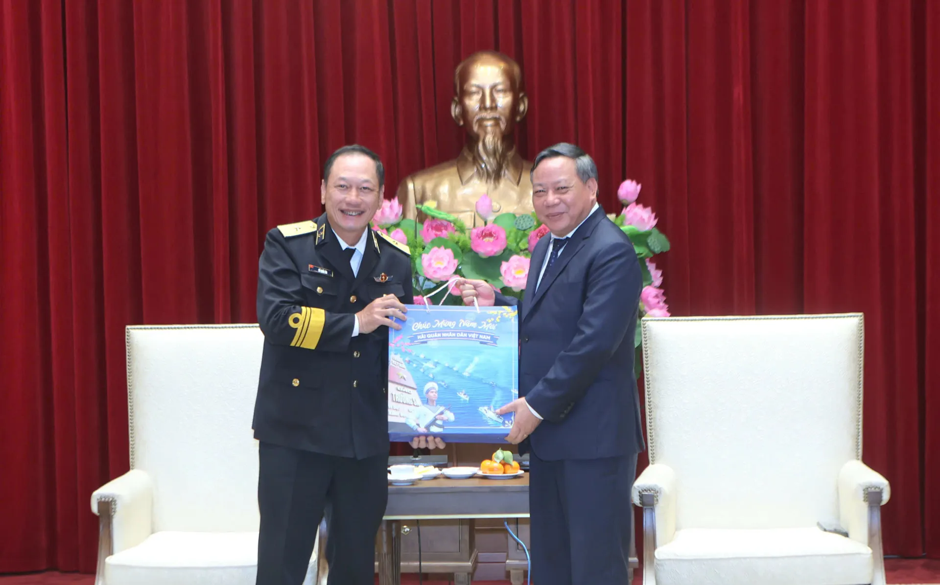 Phó Bí thư Thường trực Thành ủy Nguyễn Văn Phong tặng quà chúc mừng năm mới của TP tới Đoàn công tác của Quân chủng Hải quân.