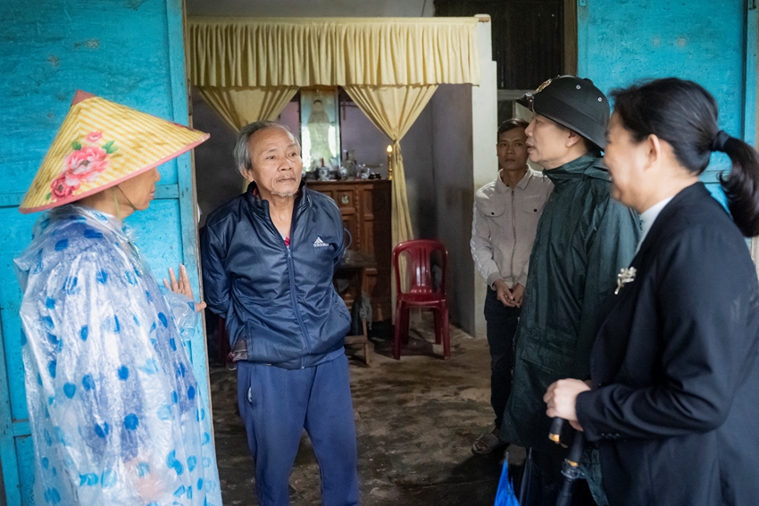 Phó Chủ tịch UBND thành phố Huế Phan Quý Phương động viên, hỏi thăm người dân tại địa bàn thấp trũng, thường xuyên bị ảnh hưởng trong mùa mưa bão ở phường An Cựu