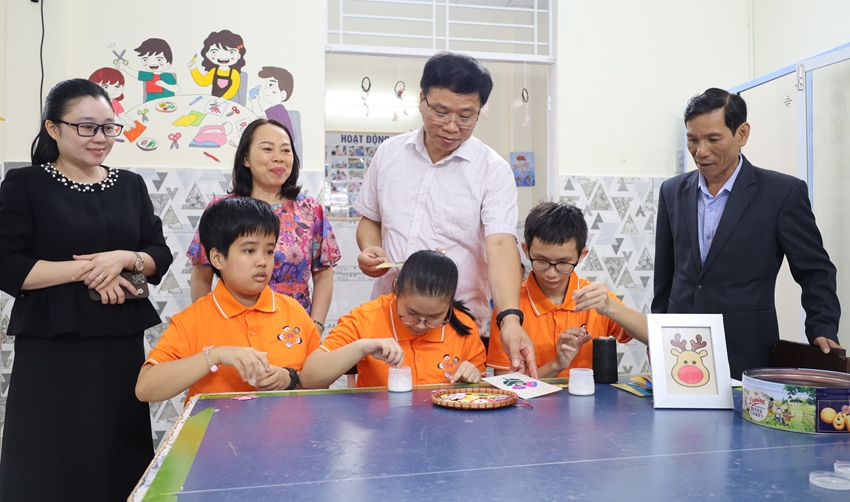 Đồng chí Phan Xuân Toàn, UVTV, Trưởng ban Tổ chức Thành ủy thăm và xem các em ở cơ sở bảo trợ trẻ em khuyết tật Tâm Bình làm sản phẩm thủ công. Ảnh: Hữu Phúc