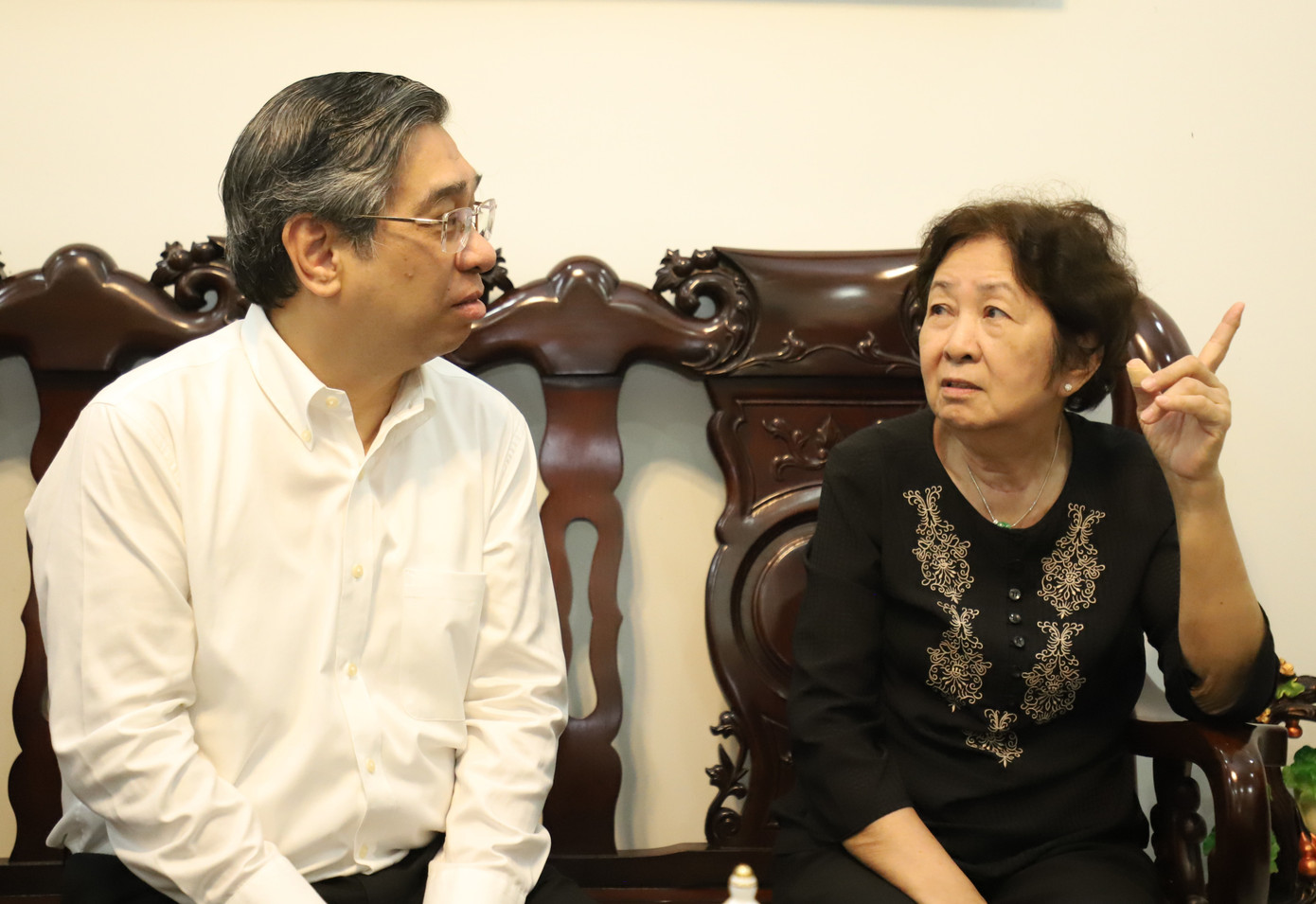 Ông Nguyễn Phước Lộc cùng Bí thư Đảng ủy, Chủ tịch HĐND phường Xuân Hòa Nguyễn Thanh Xuân trò chuyện, thăm hỏi bà Huỳnh Xuân Thảo, con gái cố kiến trúc sư Huỳnh Tấn Phát. Ảnh: Ngô Tùng