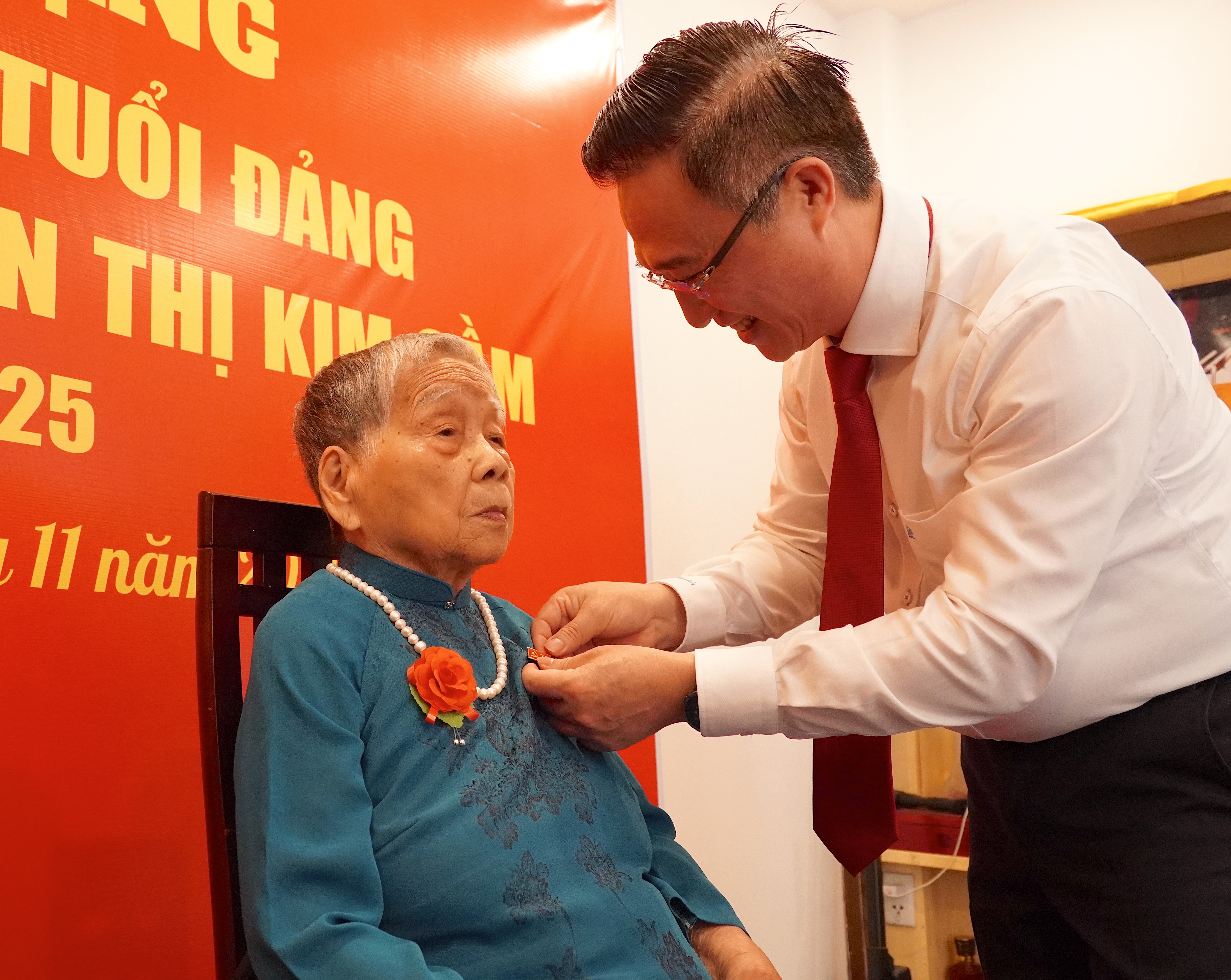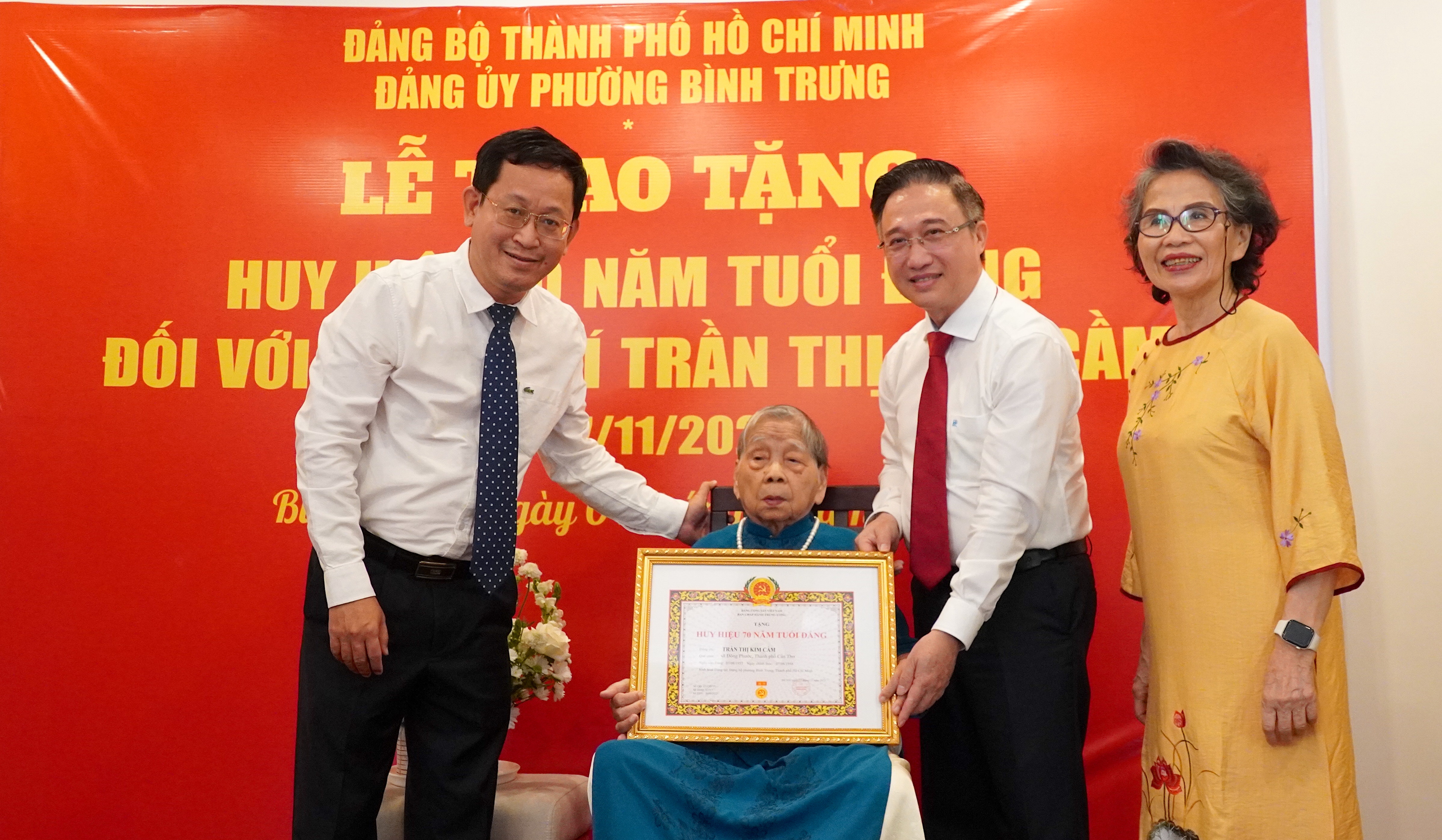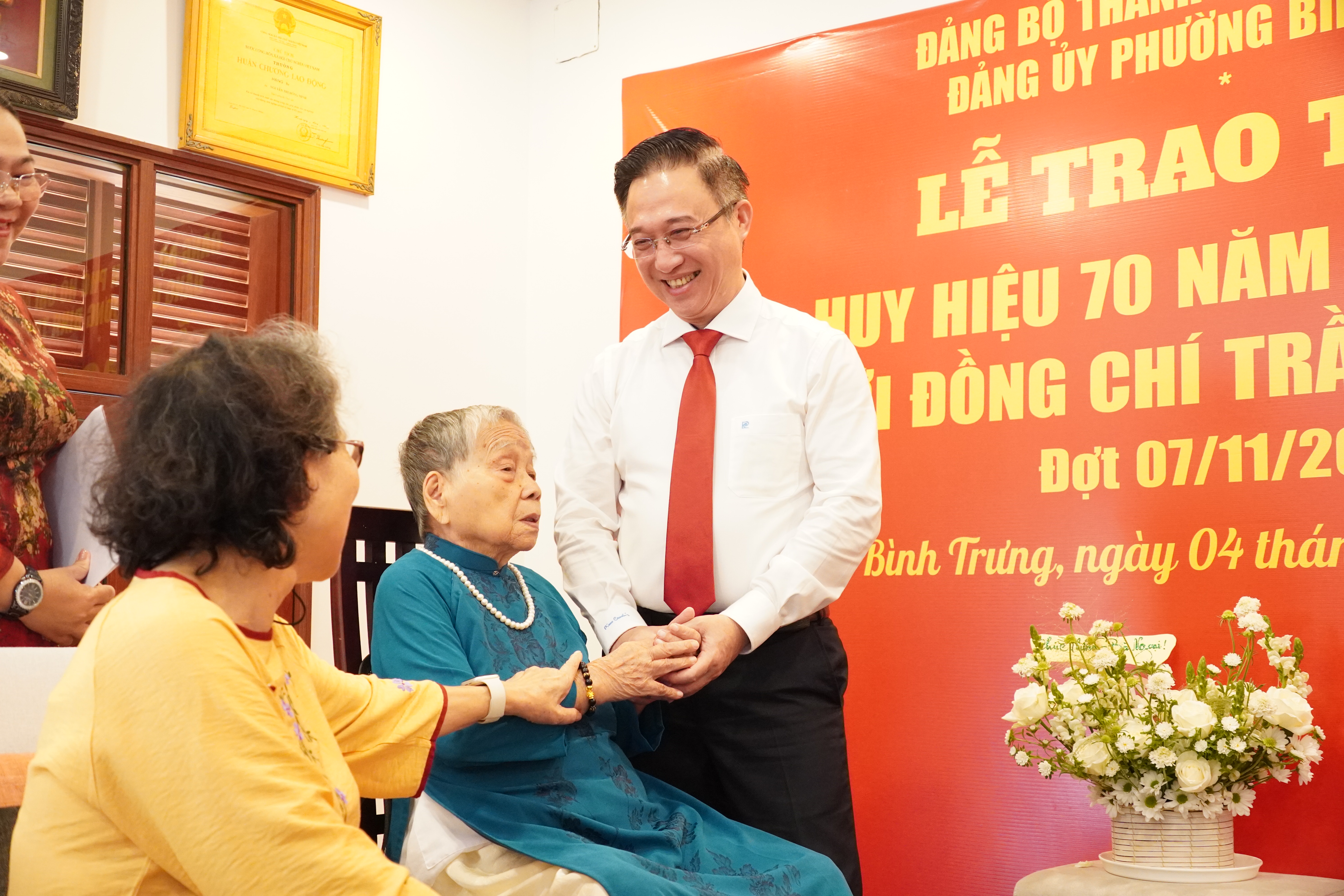 Tại buổi lễ, đồng chí Đặng Minh Thông đã trao Quyết định tặng Huy hiệu 70 năm tuổi Đảng và hoa chúc mừng đến đồng chí Trần Thị Kim Cầm (sinh năm 1926, sinh hoạt tại Chi bộ khu phố 5, Đảng bộ phường Bình Trưng).