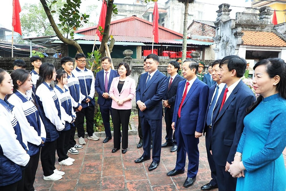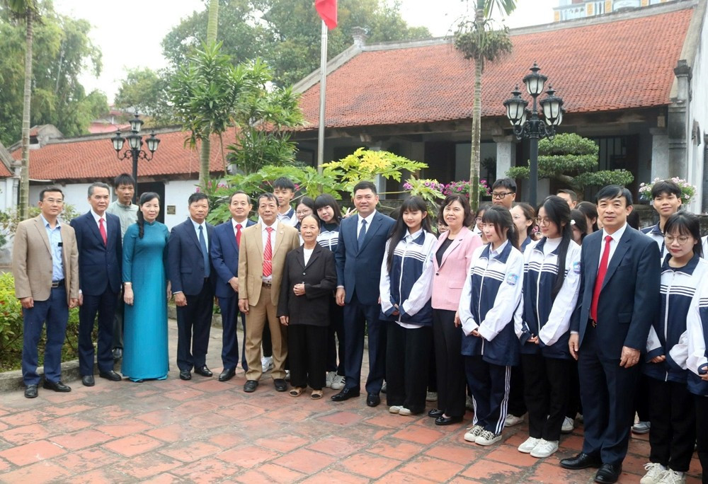 Bí thư Tỉnh ủy Nguyễn Hồng Thái cùng lãnh đạo tỉnh nói chuyện với các em học sinh Trường THPT Ngô Gia Tự tại Nhà lưu niệm đồng chí Ngô Gia Tự, phường Tam Sơn.
