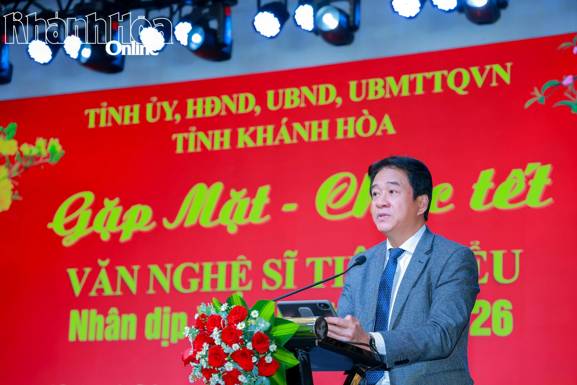 Chiều 4-2, Tỉnh ủy, HĐND, UBND, Ủy ban MTTQ Việt Nam tỉnh Khánh Hòa tổ chức gặp mặt, chúc tết văn nghệ sĩ tiêu biểu nhân dịp xuân Bính Ngọ 2026. Dự gặp mặt có các đồng chí: Nguyễn Long Biên - Ủy viên Ban Thường vụ Tỉnh ủy, Phó Chủ tịch Thường trực UBND tỉnh; Lê Hữu Trí - Phó Trưởng đoàn chuyên trách phụ trách Đoàn Đại biểu Quốc hội tỉnh; lãnh đạo một số sở, ban, ngành cùng các văn nghệ sĩ tiêu biểu.
