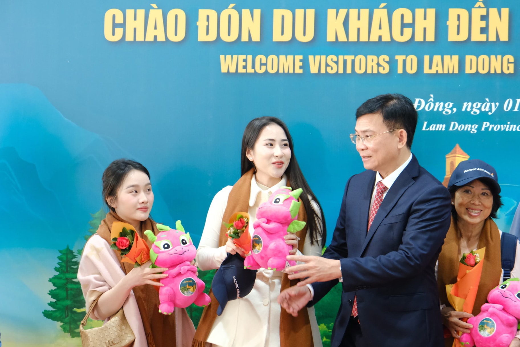 Trong không khí vui tươi, phấn khởi chào năm mới 2026, lãnh đạo tỉnh cùng đại diện Sở Văn hóa, Thể thao và Du lịch; Trung tâm Xúc tiến Đầu tư, Thương mại và Du lịch; Hiệp hội Du lịch tỉnh; Cảng hàng không Quốc tế Liên Khương và Tổng Công ty Hàng không Việt Nam (Vietnam Airlines) đã trực tiếp đón và tặng quà cho khoảng 250 du khách đầu tiên đến Lâm Đồng trong sáng đầu năm.