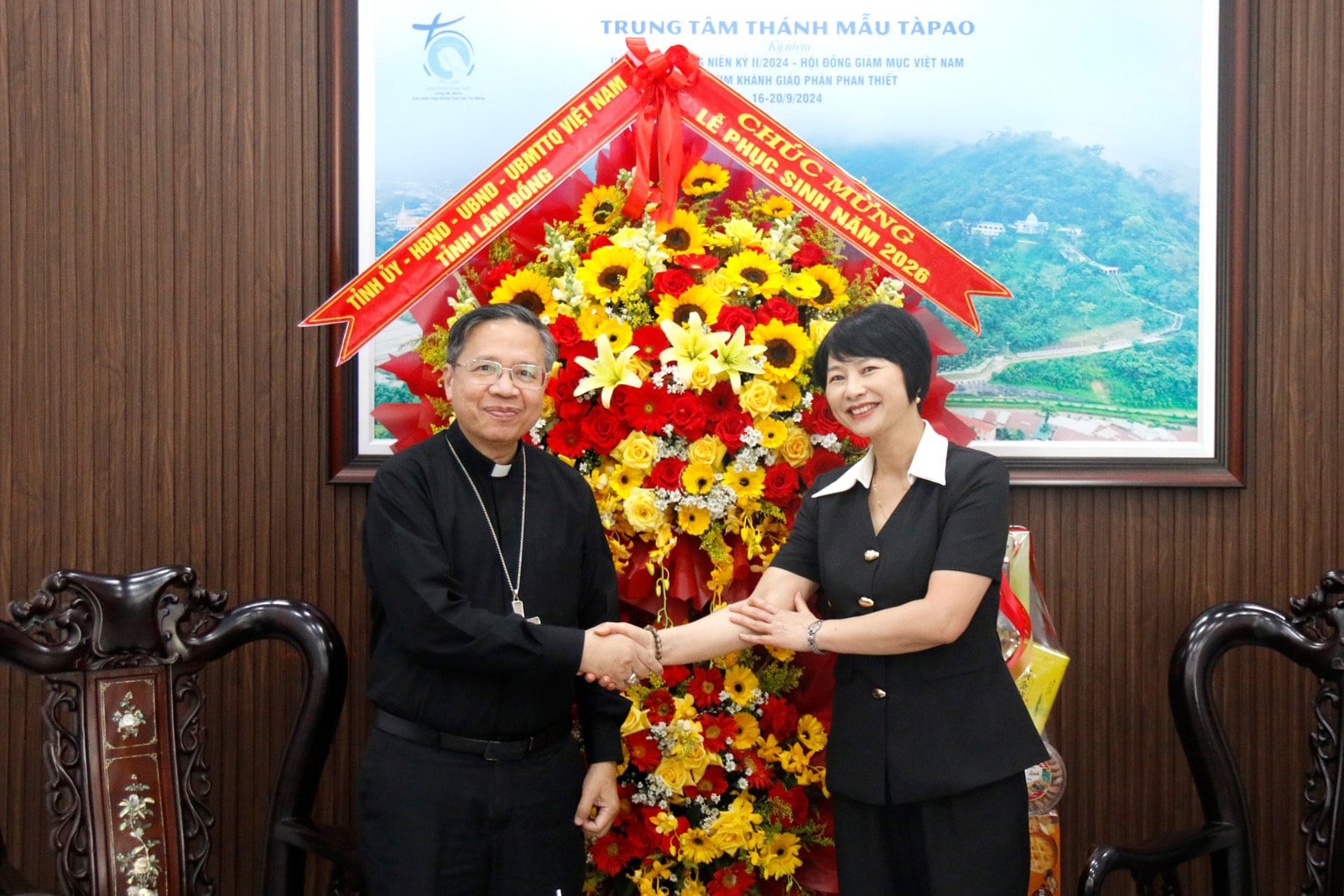 Phó Bí thư Tỉnh ủy tặng lẵng hoa của Tỉnh ủy - HĐND - UBND - Ủy ban MTTQ Việt Nam tỉnh Lâm Đồng nhân dịp Lễ Phục sinh năm 2026 tại Giáo phận Phan Thiết