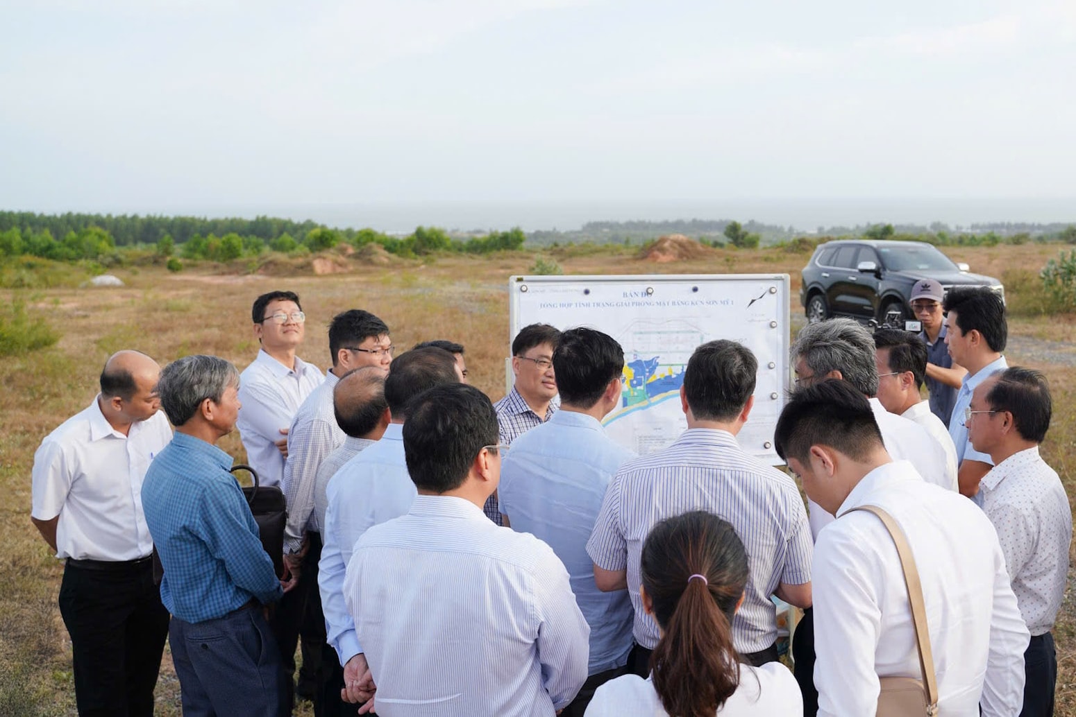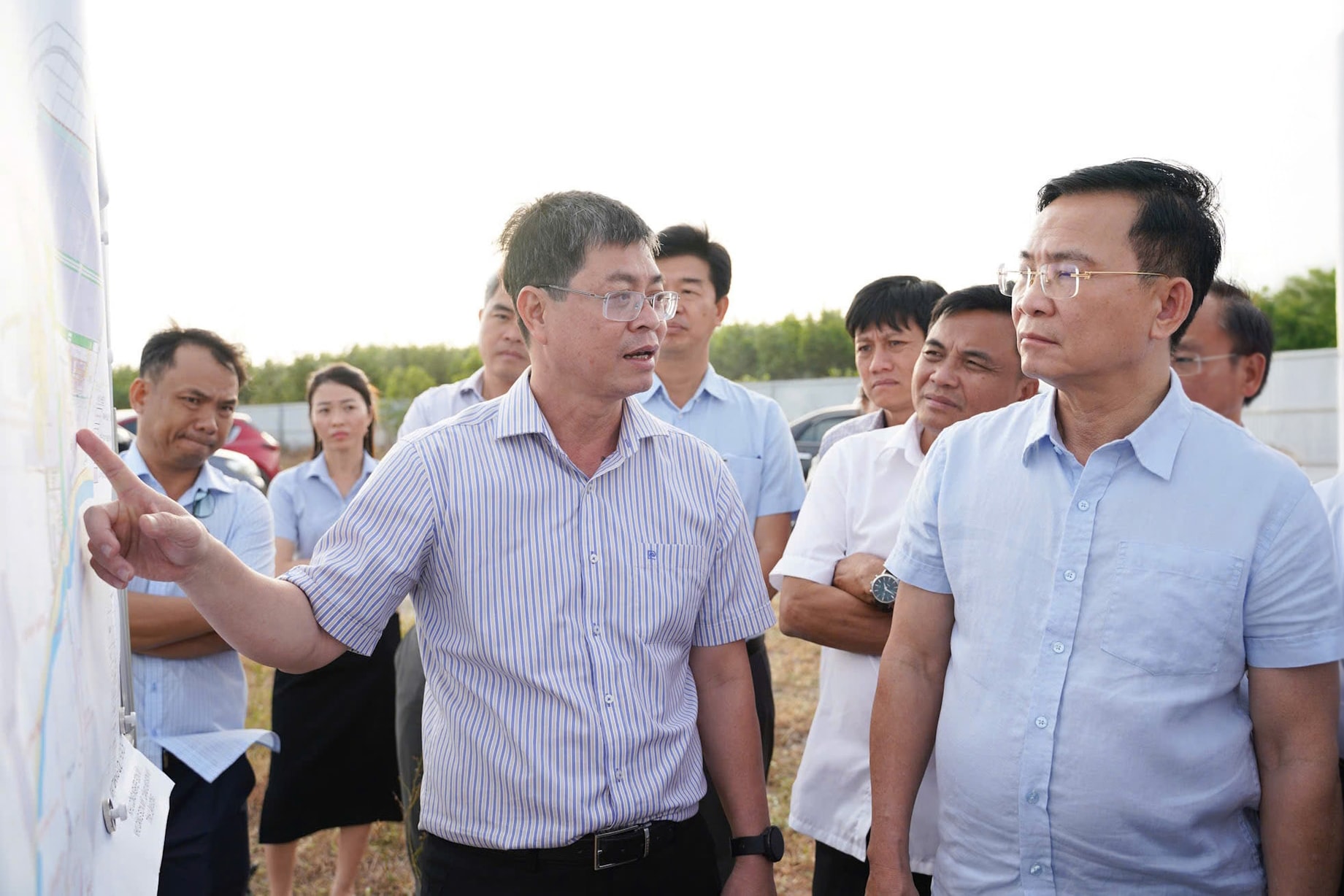 Phó Chủ tịch UBND tỉnh Lâm Đồng Nguyễn Hồng Hải báo cáo với Chủ tịch UBND tỉnh Lâm Đồng Hồ Văn Mười tình hình triển khai Dự án Khu Công nghiệp Sơn Mỹ 1 (xã Sơn Mỹ)
