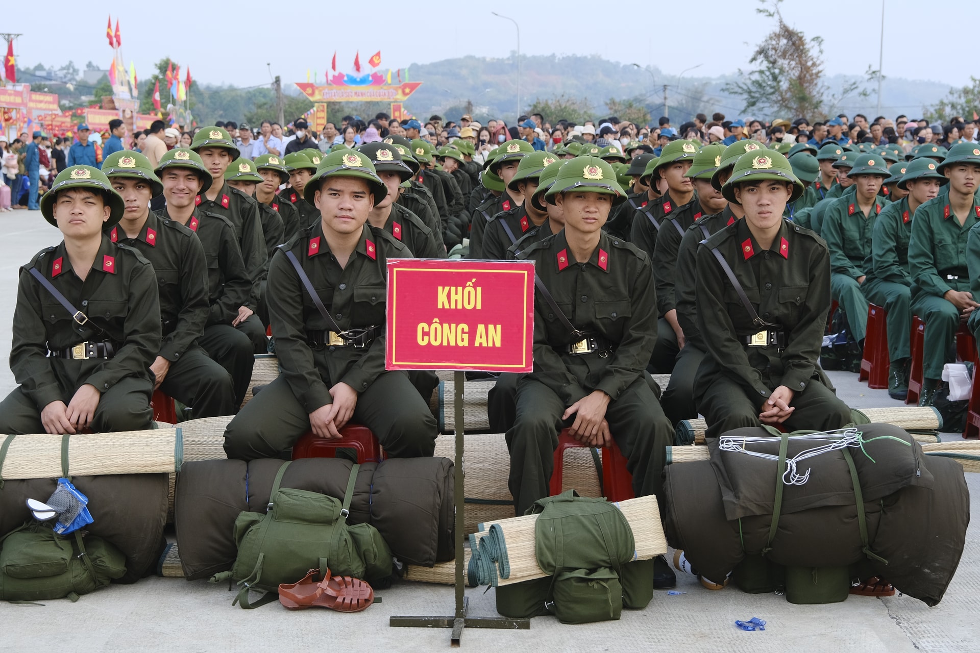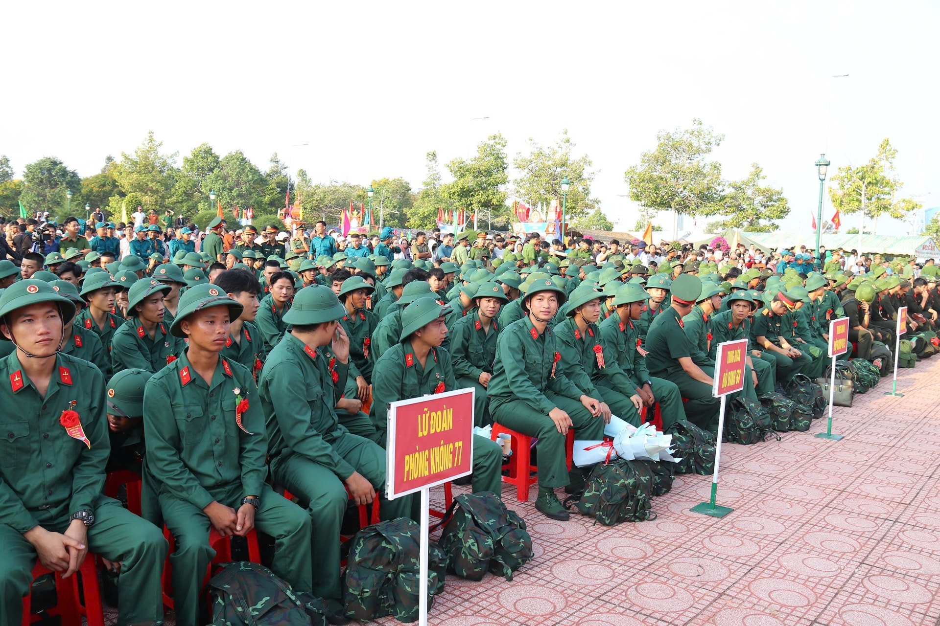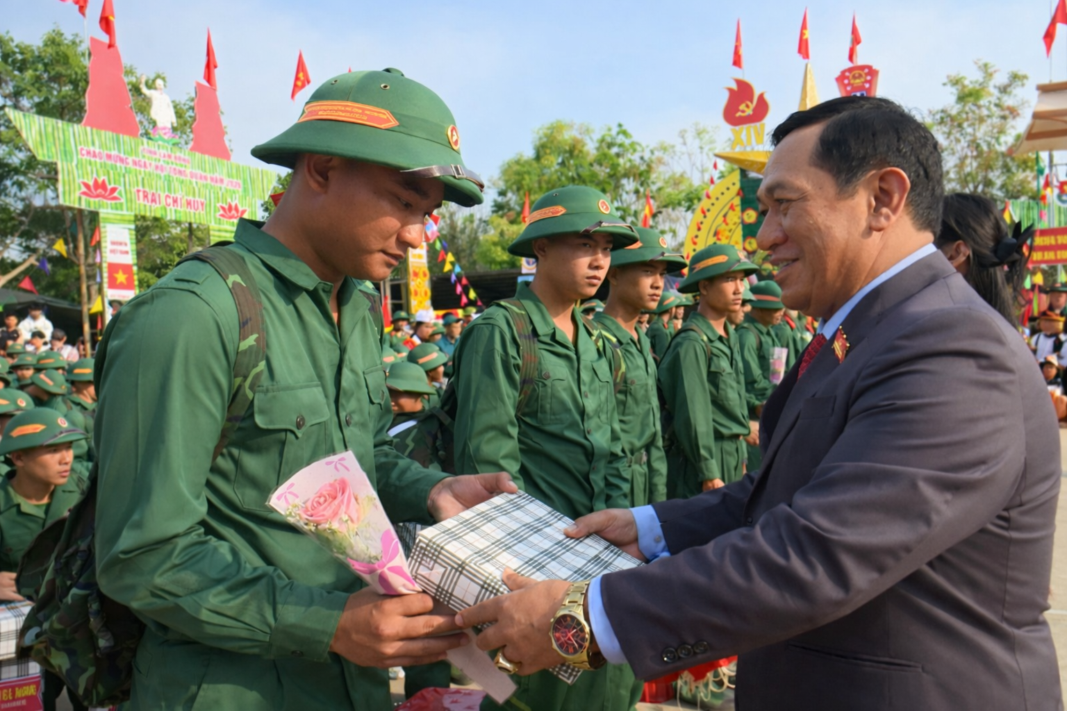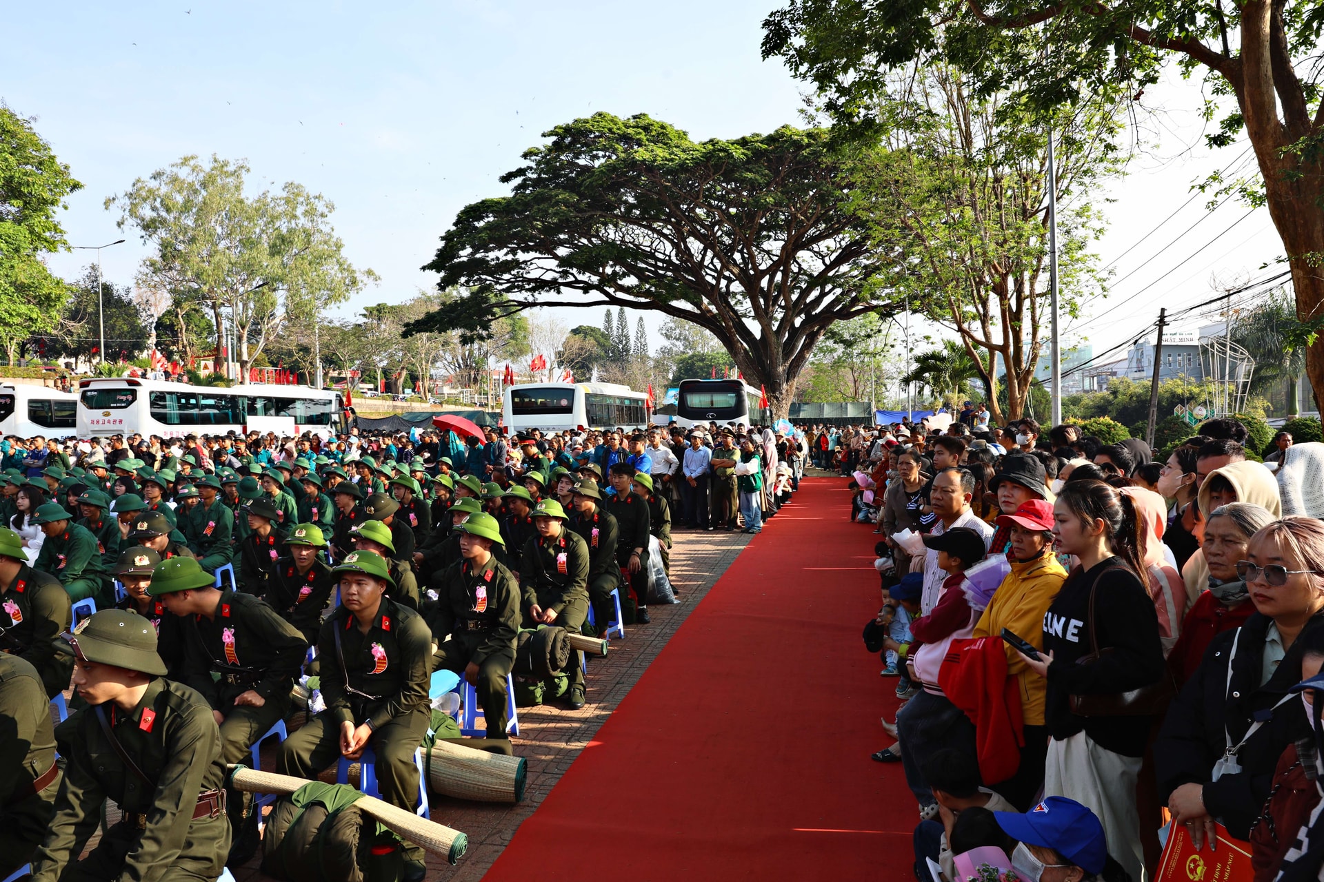Dù lễ chính thức bắt đầu lúc 7 giờ 30 phút, nhưng từ sáng sớm, không khí tại khu vực tổ chức đã rộn ràng, cờ hoa rực rỡ. Đông đảo người thân, bạn bè và Nhân dân có mặt để tiễn con em mình lên đường làm nhiệm vụ. Những cái bắt tay thật chặt, những lời dặn dò ân cần, những ánh mắt vừa tự hào vừa lưu luyến đã tạo nên khoảnh khắc xúc động, tiếp thêm động lực cho các tân binh.